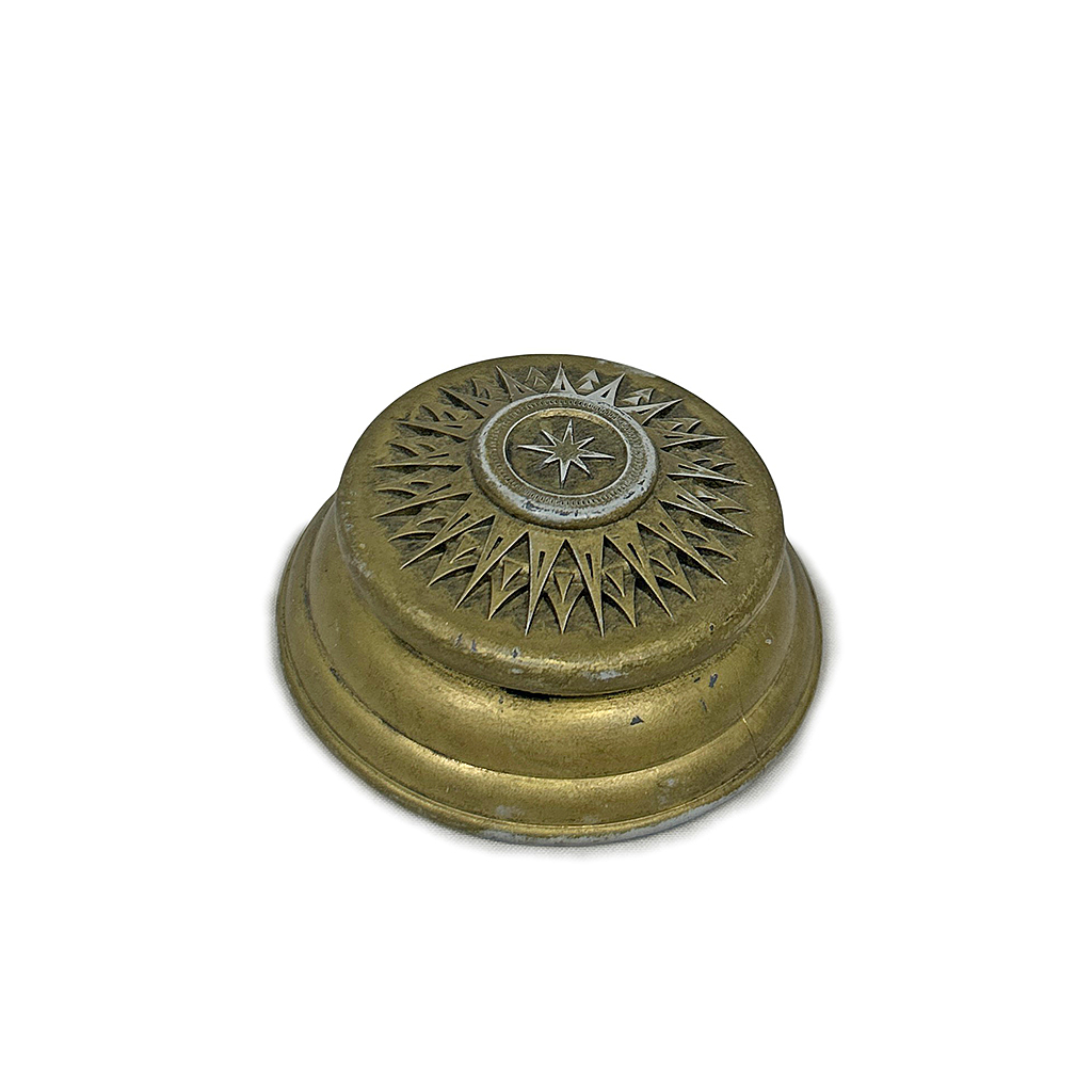 SMALL WOODEN FLAT BOX WITH LID AND STAR SHAPE CARVED DECORATION 3.5 CM HIGH / 9 CM DIAMETER