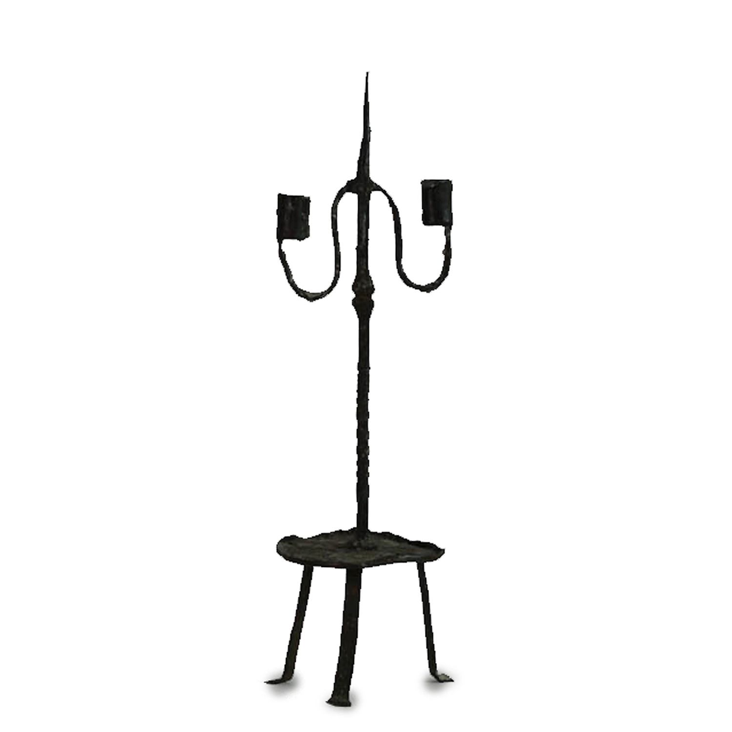 SMALL WROUGHT IRON GOTHIC CANDELABRA TWO LIGHT TRI-LEG BASE 18/i HIGH
