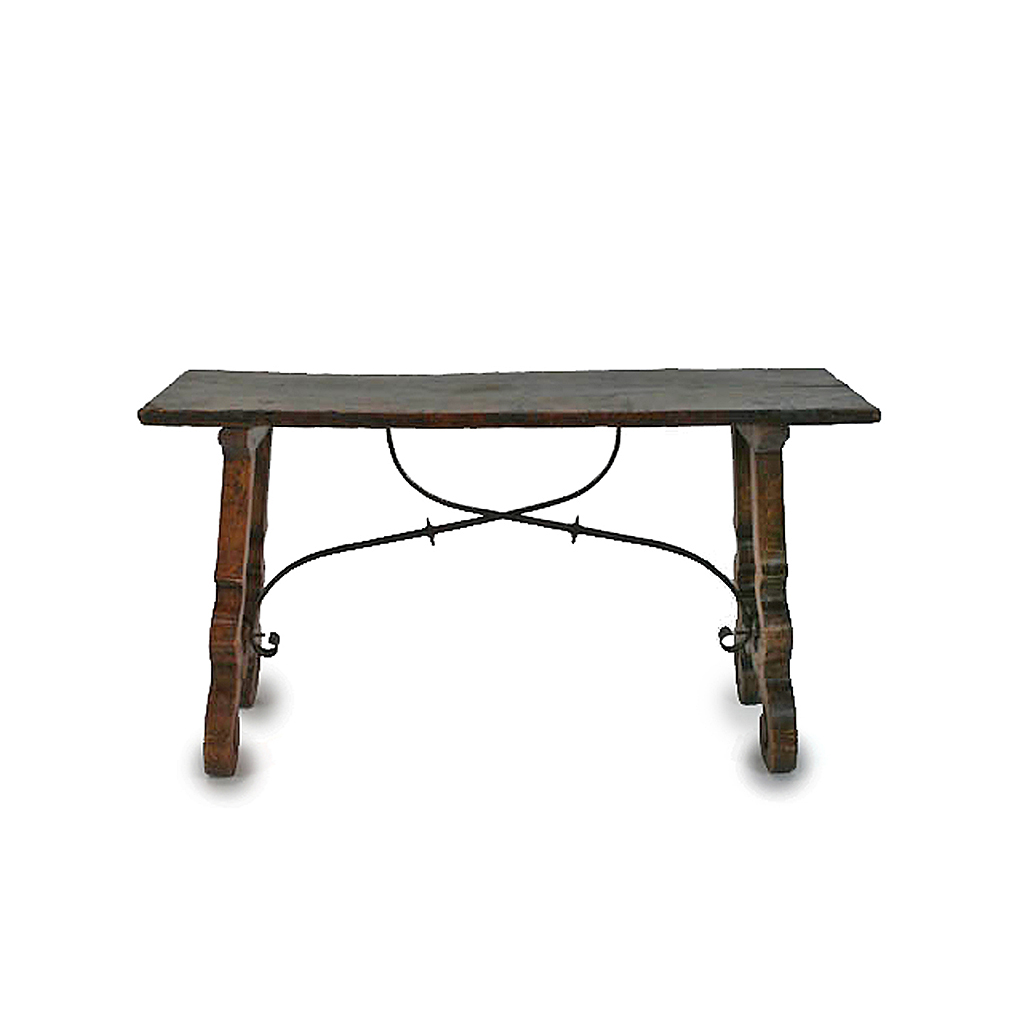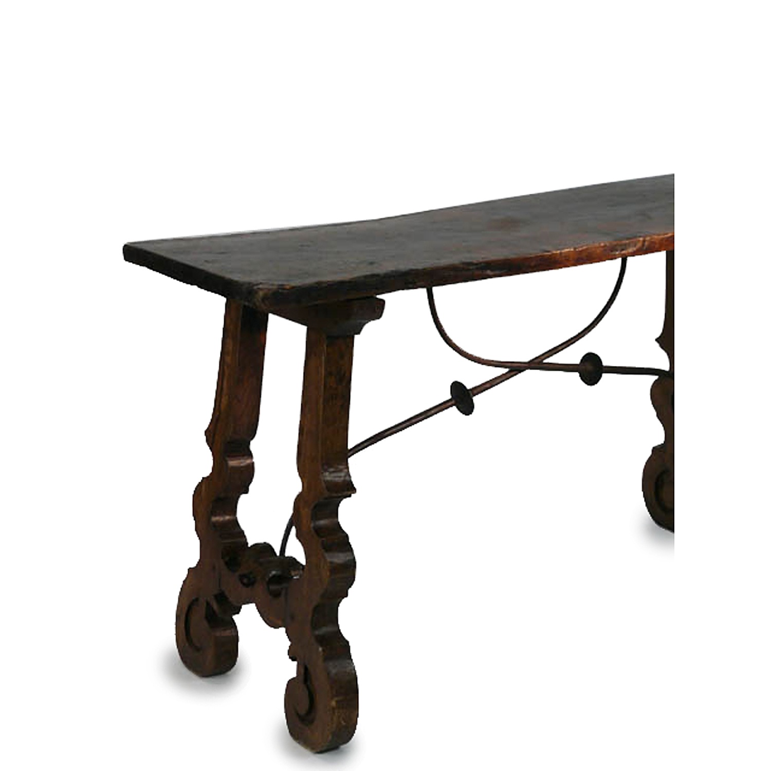 SPANISH 17TH CENT. TABLE NARROW DARK WOOD WITH WROUGHT IRON STRETCHERS 78 CM HIGH 142 CM LONG 46 CM WIDE