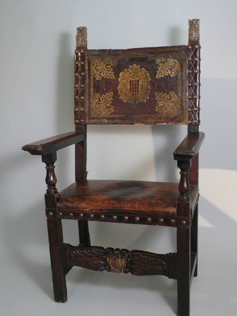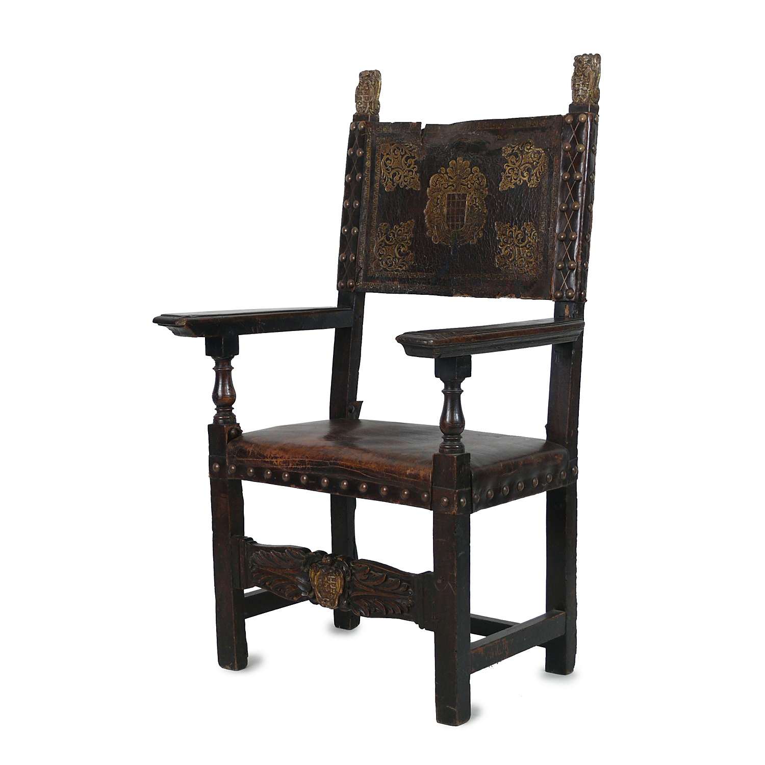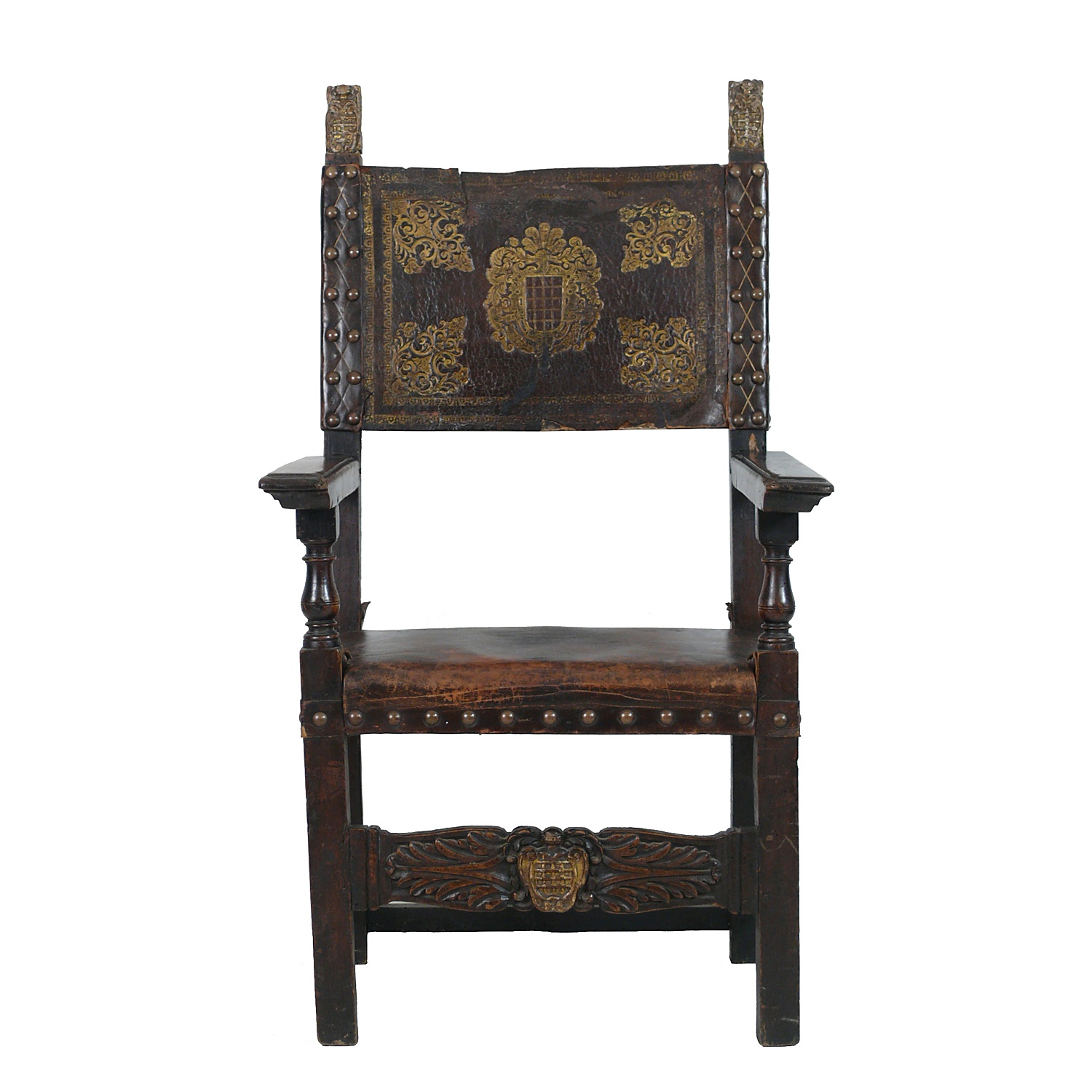 SPANISH 17TH CENT. TOOLED TAN LEATHER THRONE CHAIR 122 CM HIGH 67 CM WIDE 56 CM DEEP