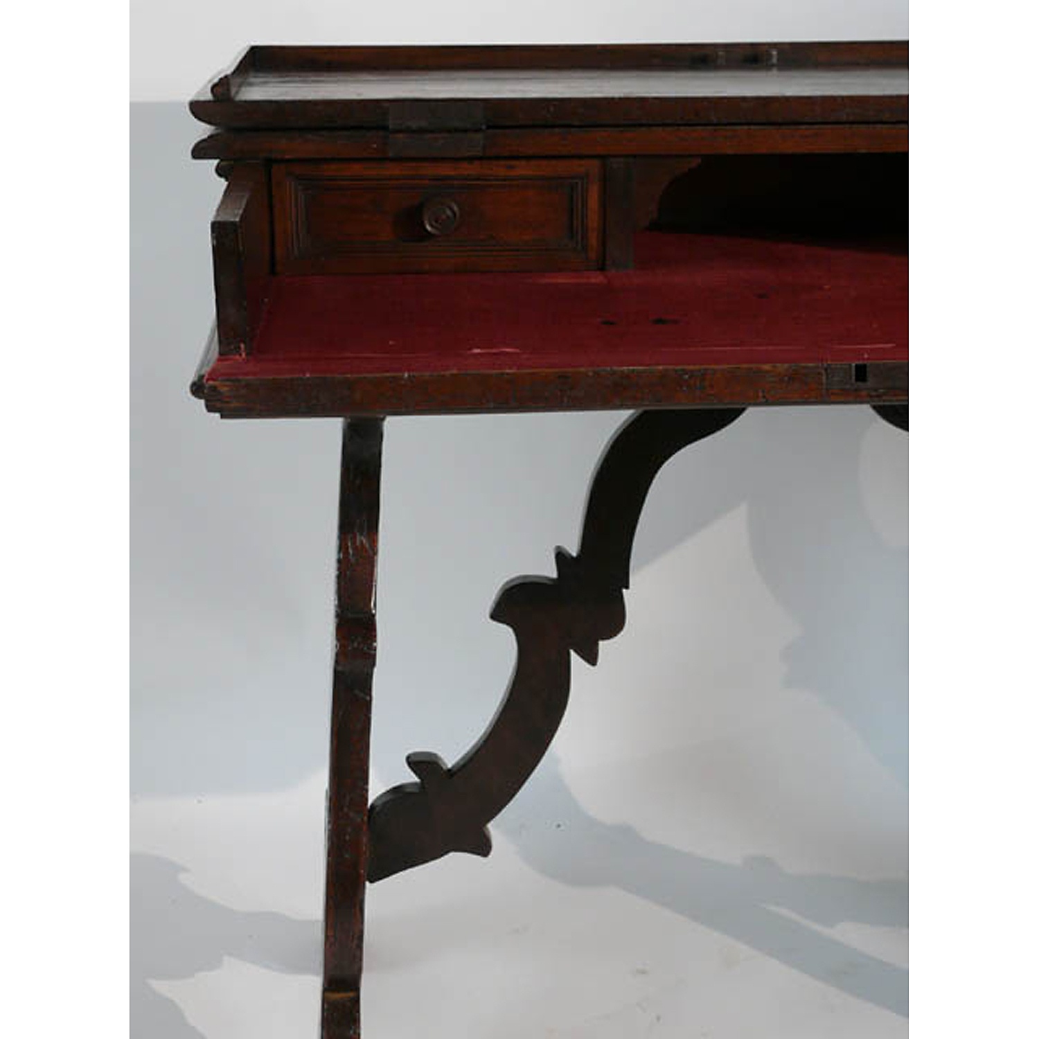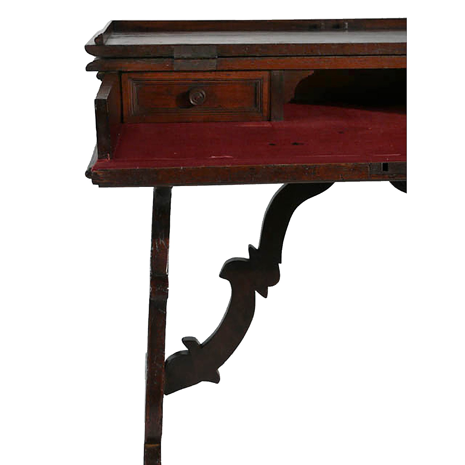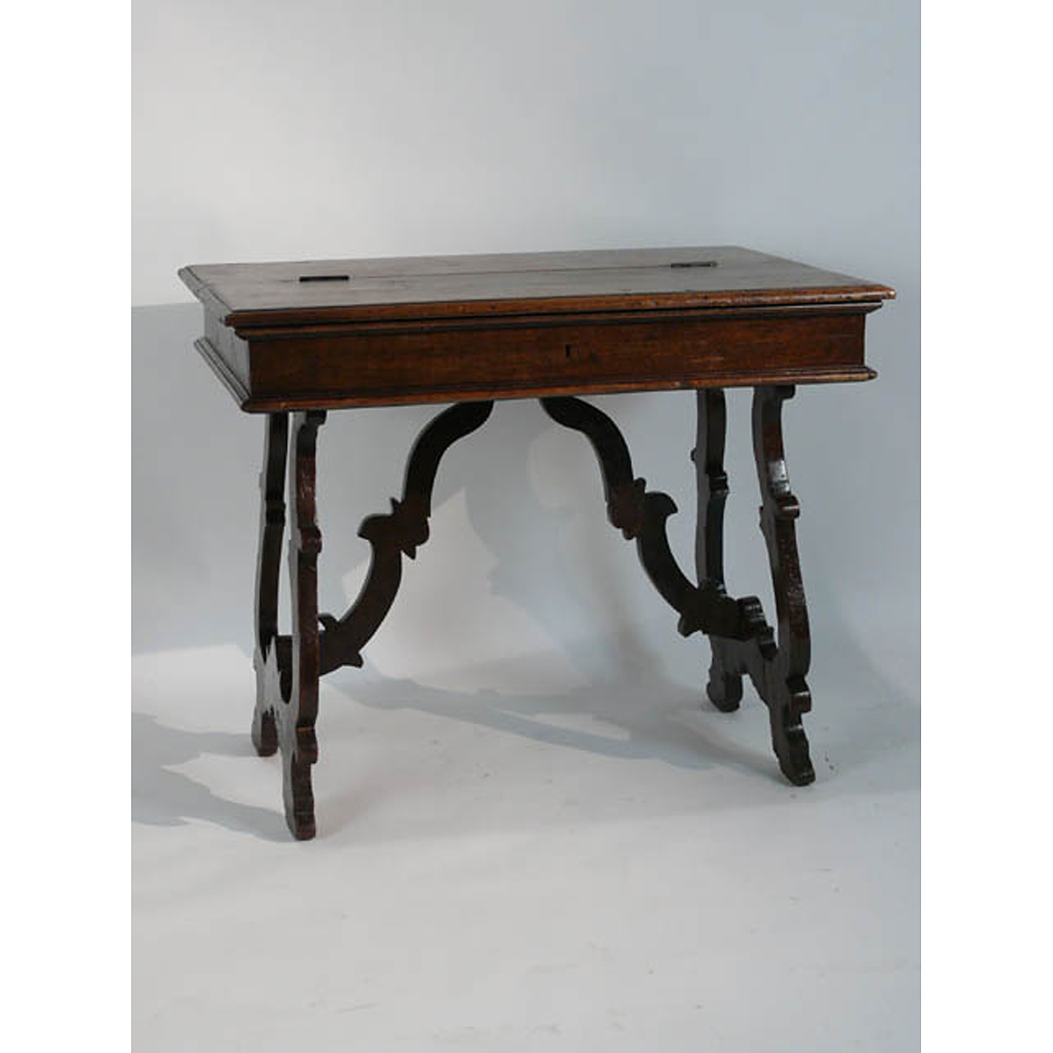SPANISH 17TH CENT. WALNUT WRITING TABLE WITH HINGED LID AND ORNATE FRETTED LEGS 3'4" WIDE