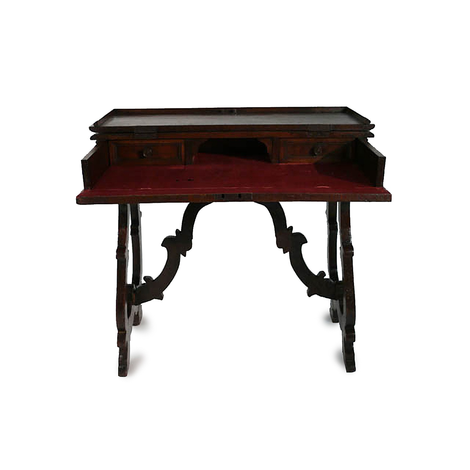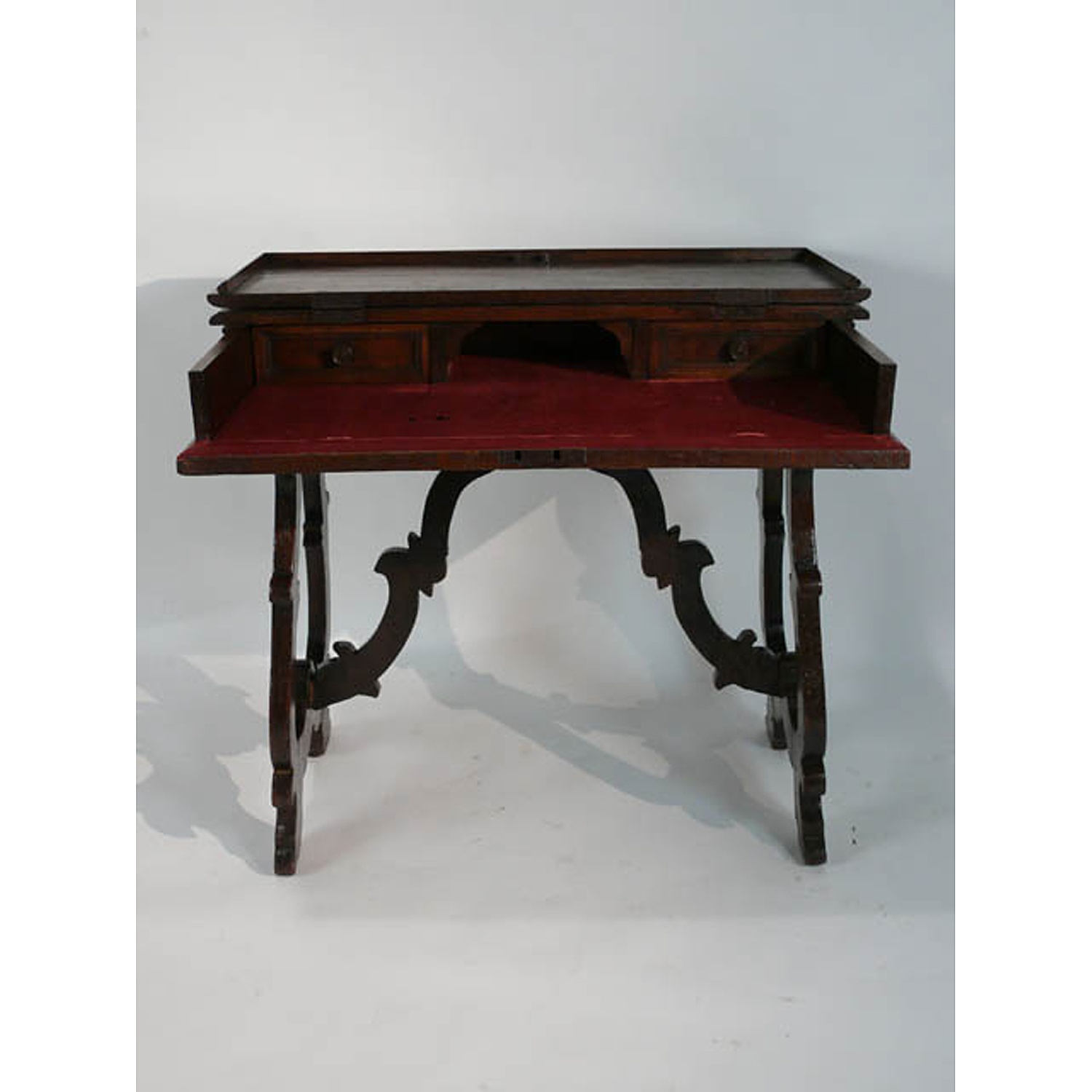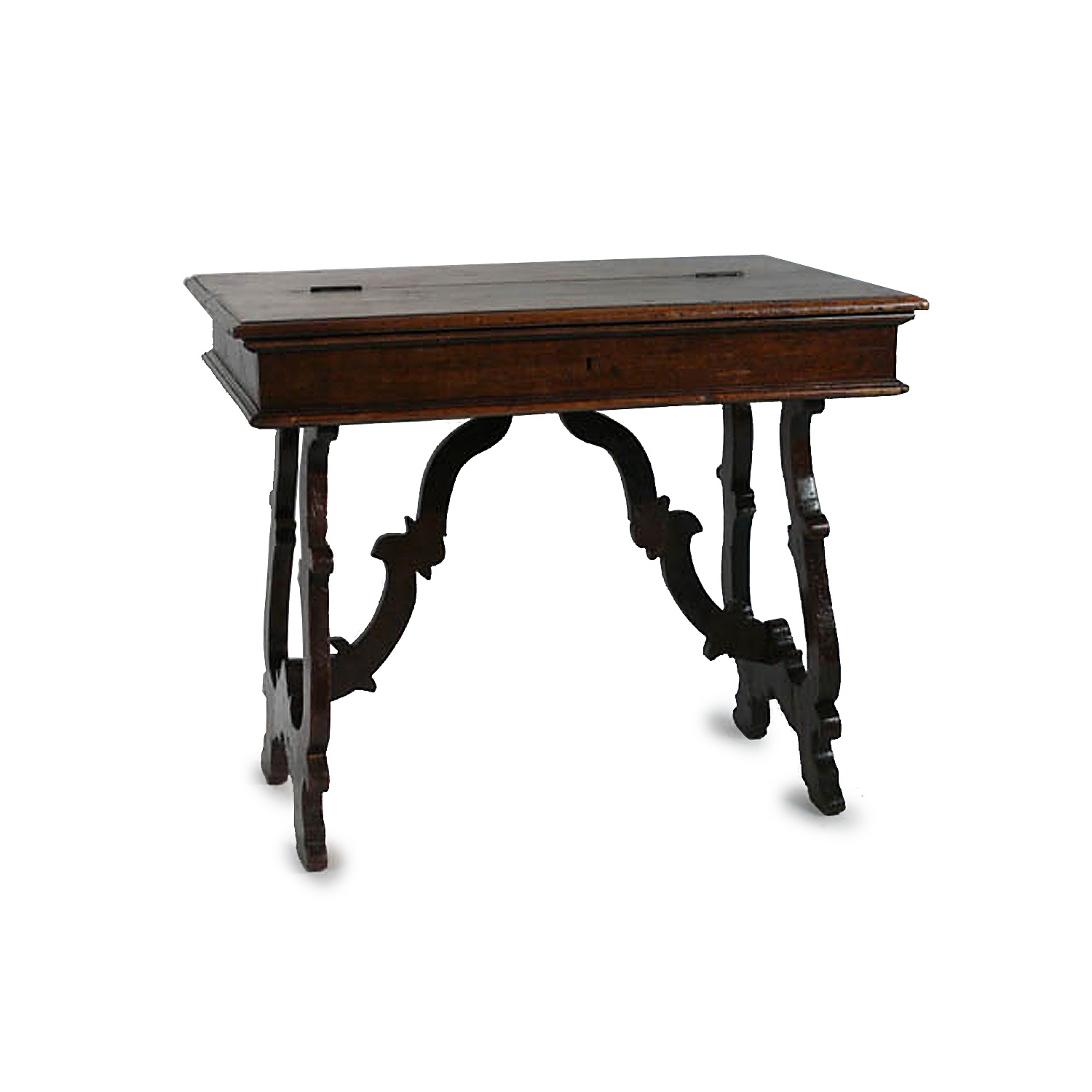 SPANISH 17TH CENT. WALNUT WRITING TABLE WITH HINGED LID AND ORNATE FRETTED LEGS 3'4" WIDE