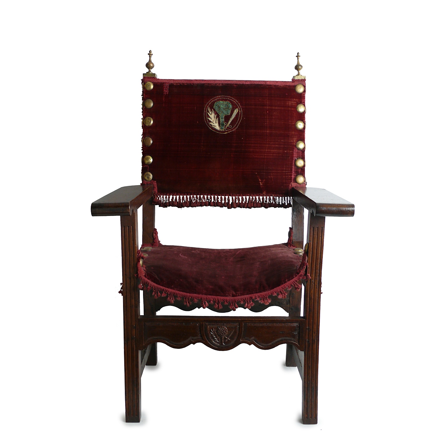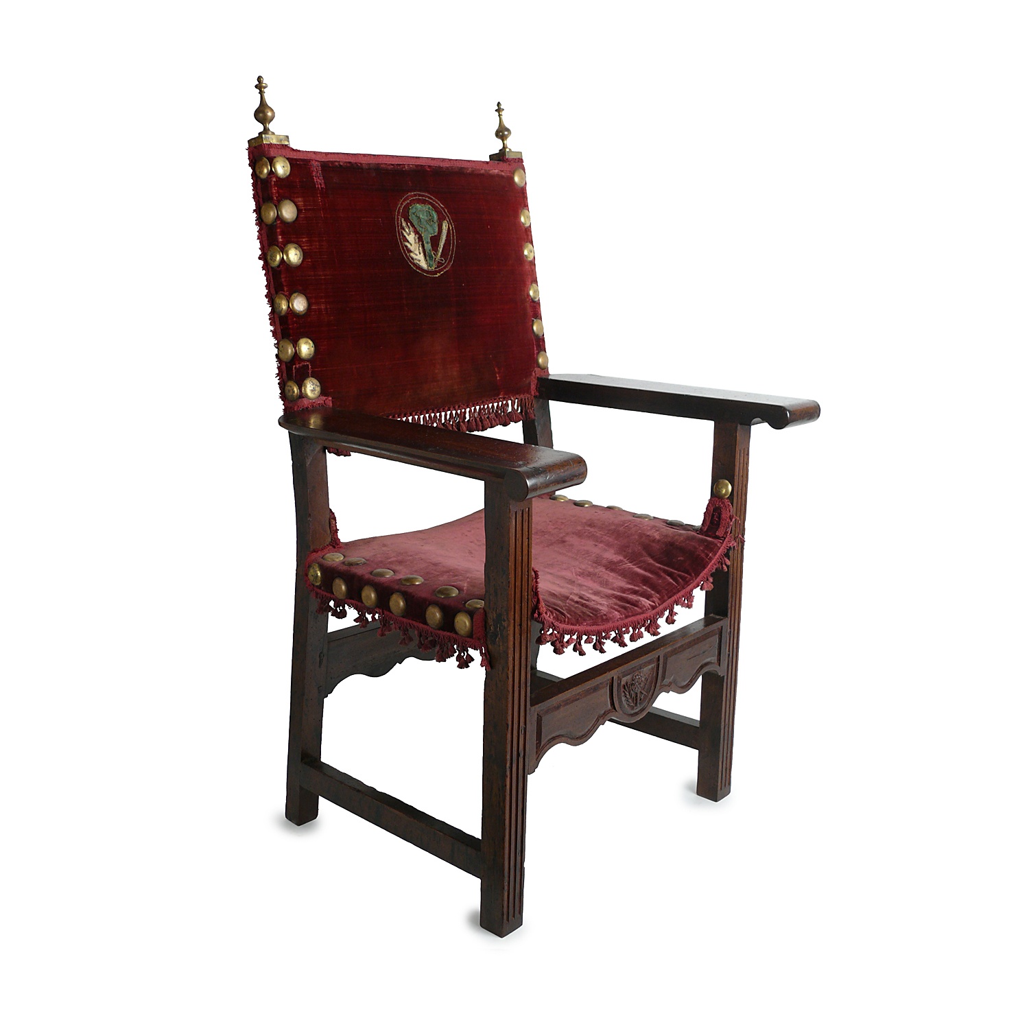 SPANISH ARM CHAIR RED VELVET SEAT AND BACK OVER CARVED CHESTNUT FRAME THE ARMS OF THE SPANISH INQUISITION TO BACK AND STRETCHER EARLY 17TH CENT 123 CM HIGH 76 CM WIDE 65 CM DEEP (X2)
