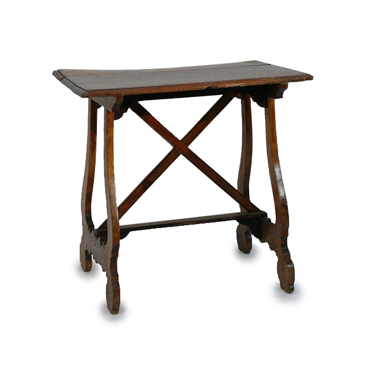 SPANISH FRUIT WOOD TABLE WITH LYRE AND X STRETCHER BASE 74 CM HIGH 79 CM LONG 52 CM WIDE