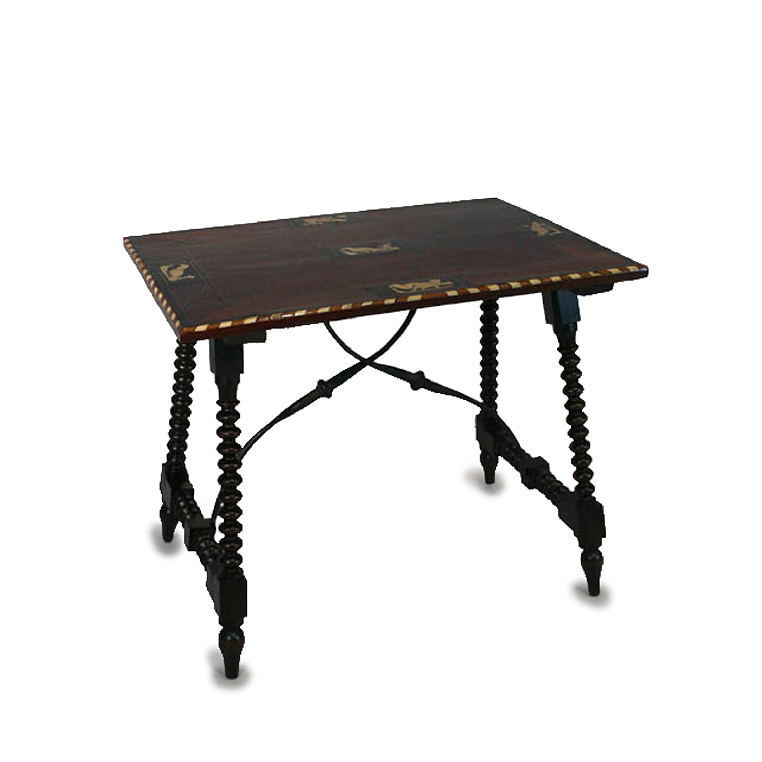 SPANISH TABLE EBONY AND IVORY INLAID TOP WITH BOBBIN TURNED LEGS AND IRON STRETCHERS 17TH CENT. 62 CM HIGH 73 CM WIDE 54 CM DEEP (X2) *APHA LICENSE FEE APPLIES*