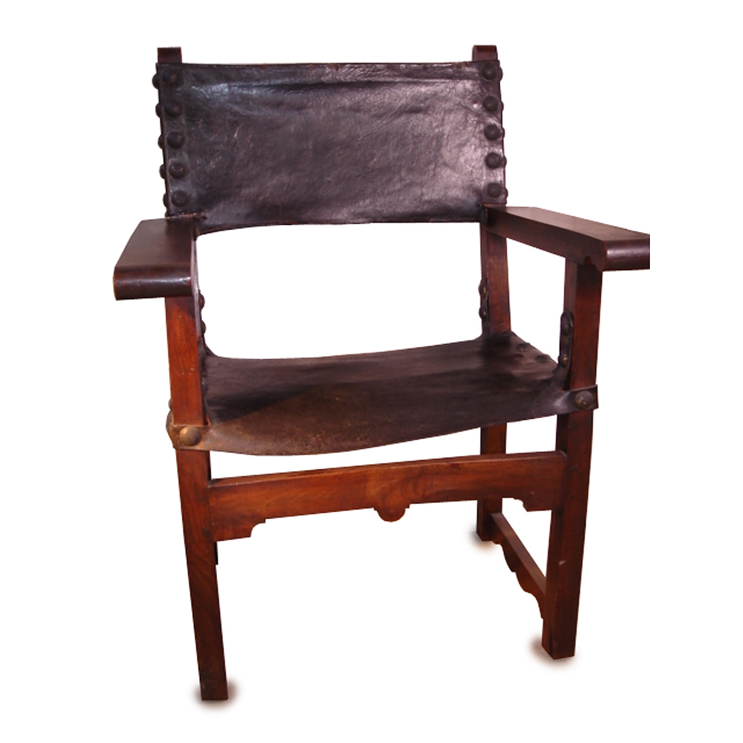 SPANISH WALNUT ARMCHAIR WITH RECTANGULAR SLUNG TAN LEATHER SEAT AND BACK 100 CM HIGH 72 CM WIDE 60 CM DEEP (X4)