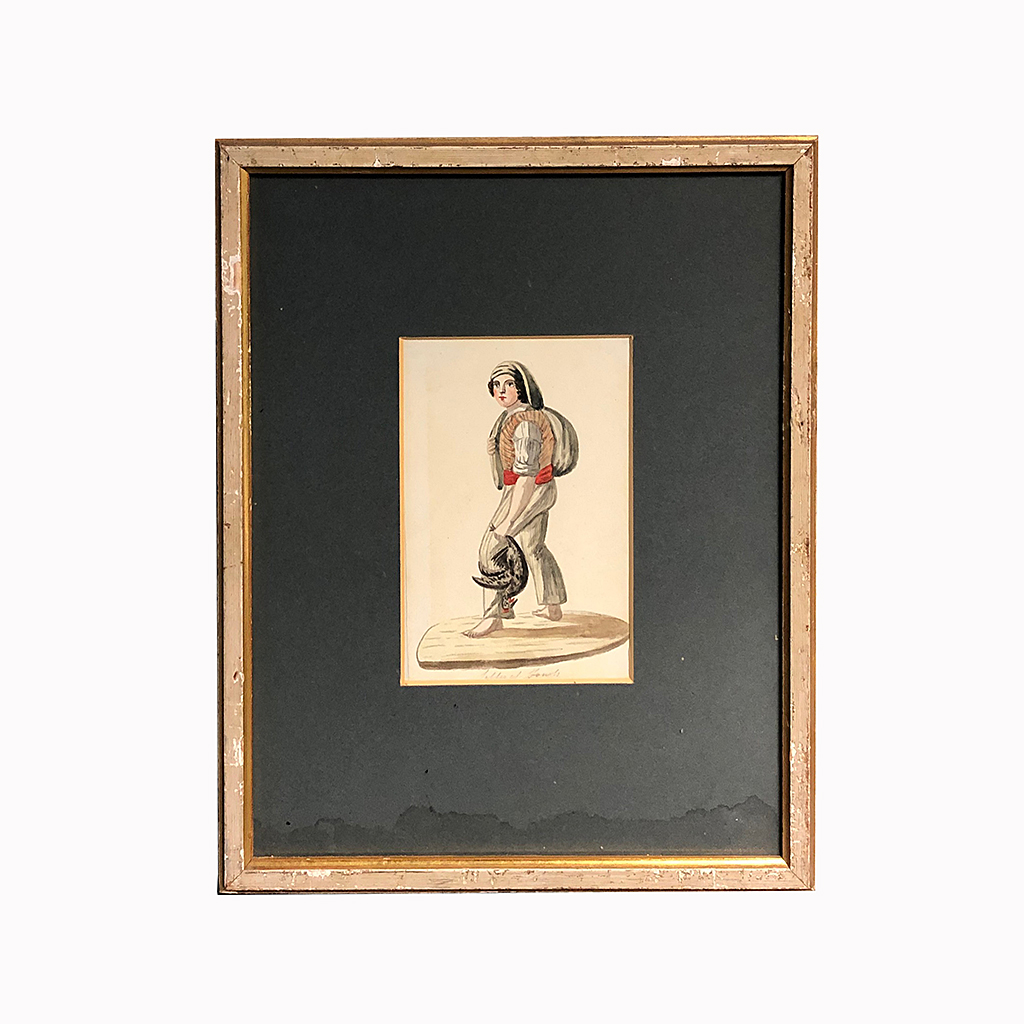 SPANISH WATERCOLOUR OF A MAN CARRYING A CHICKEN IN A SLIM CREAM FRAME WITH GREY MOUNT 12/i X 10/i