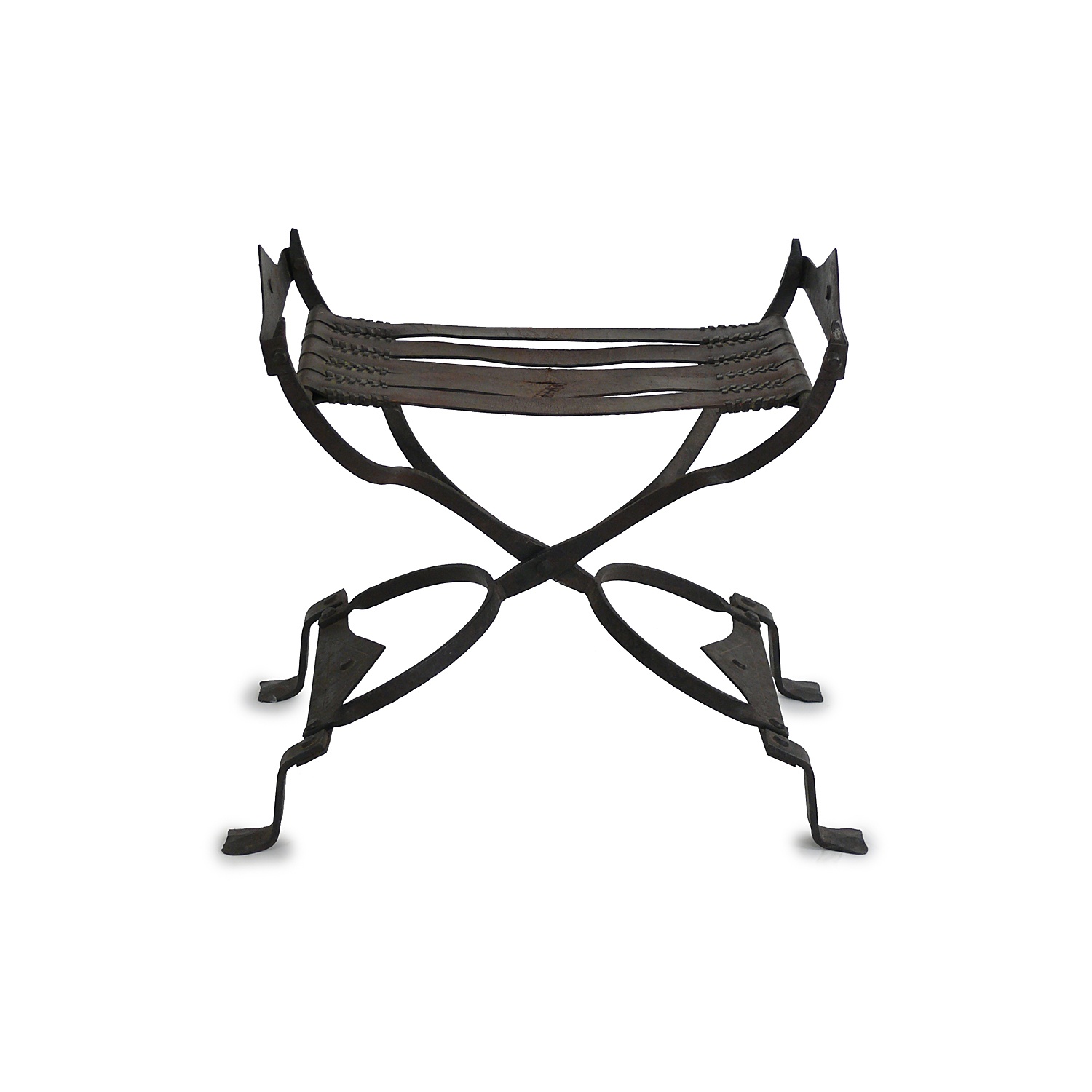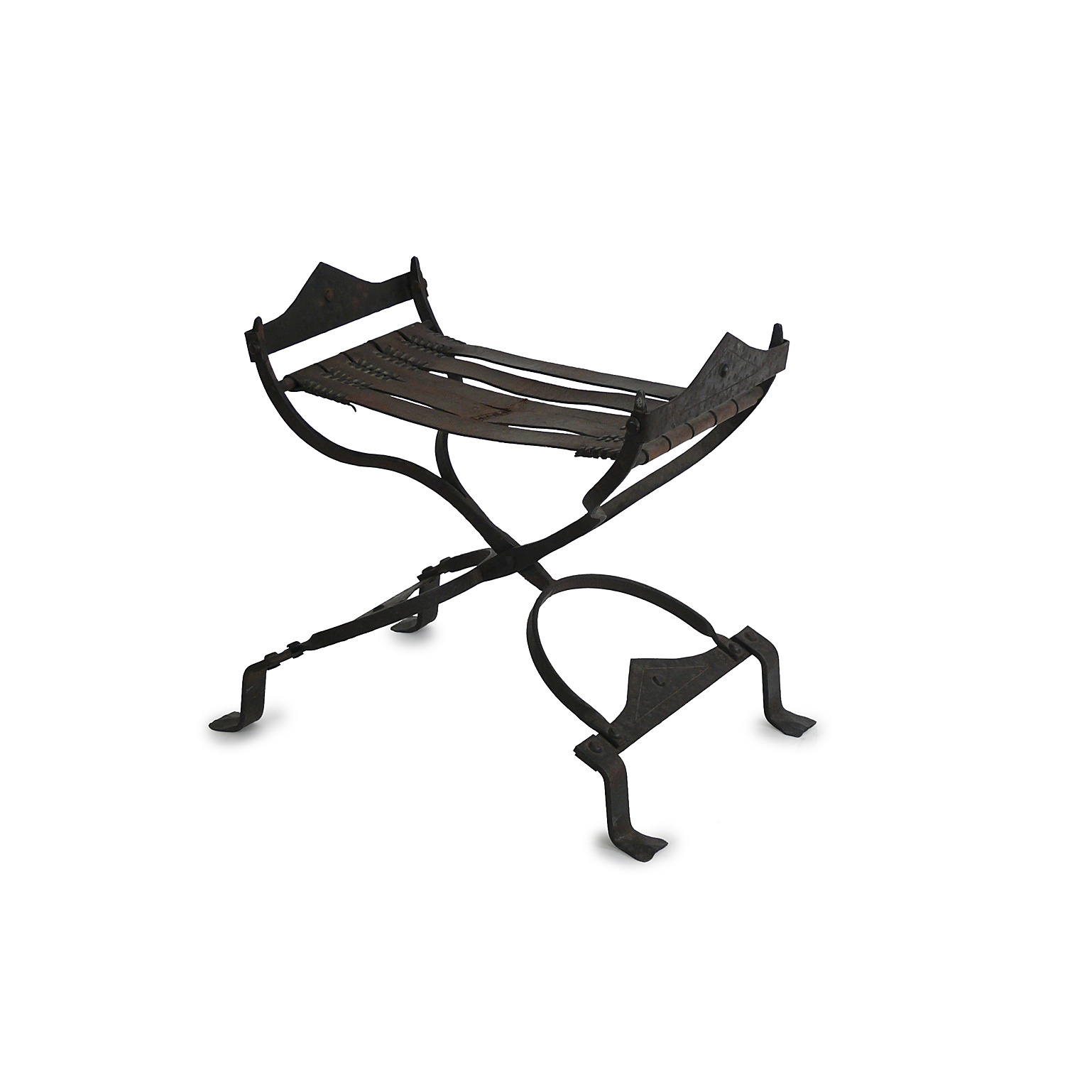 SPANISH WROUGHT IRON FOLDING STOOL WITH TAN LEATHER STRAP SEAT 16TH CENT 57 CM HIGH 64 CM WIDE 37 CM DEEP
