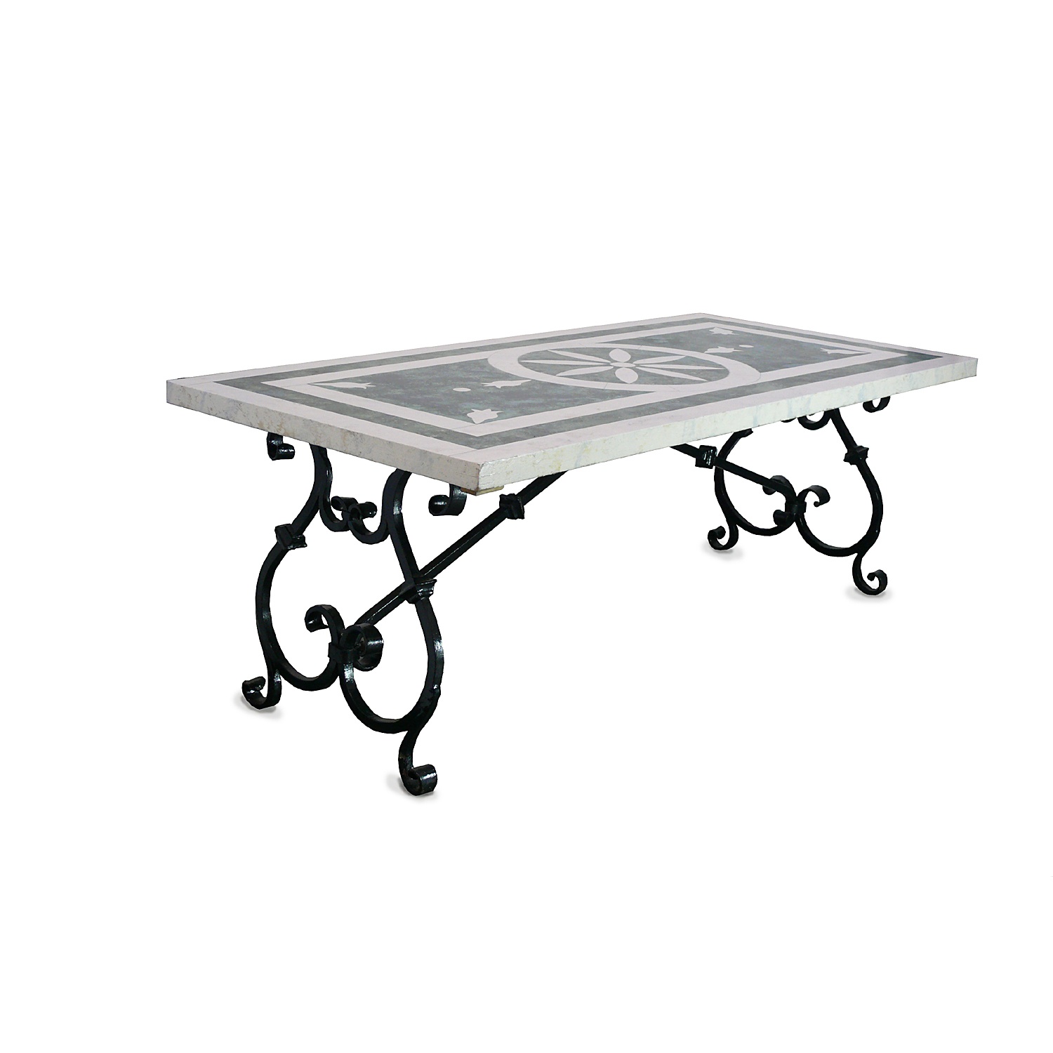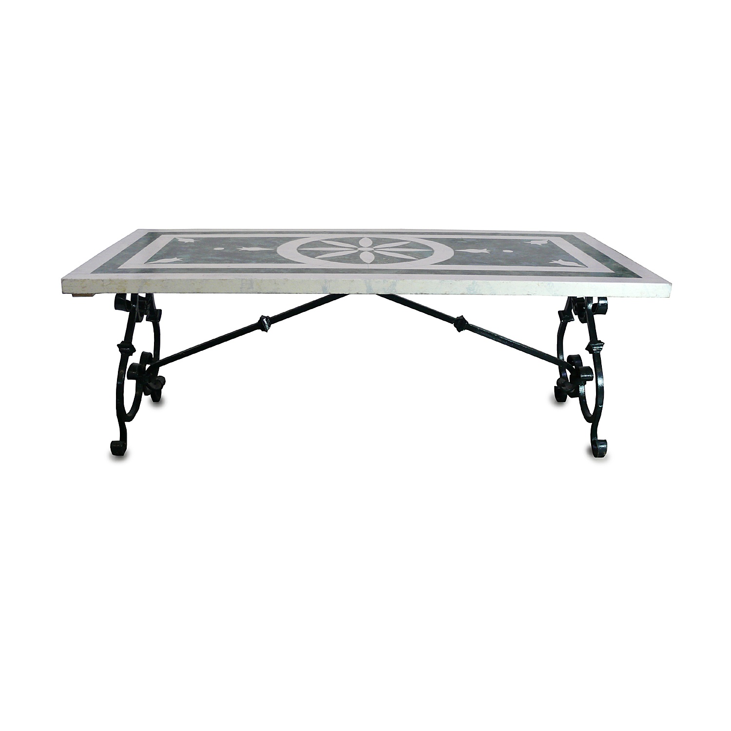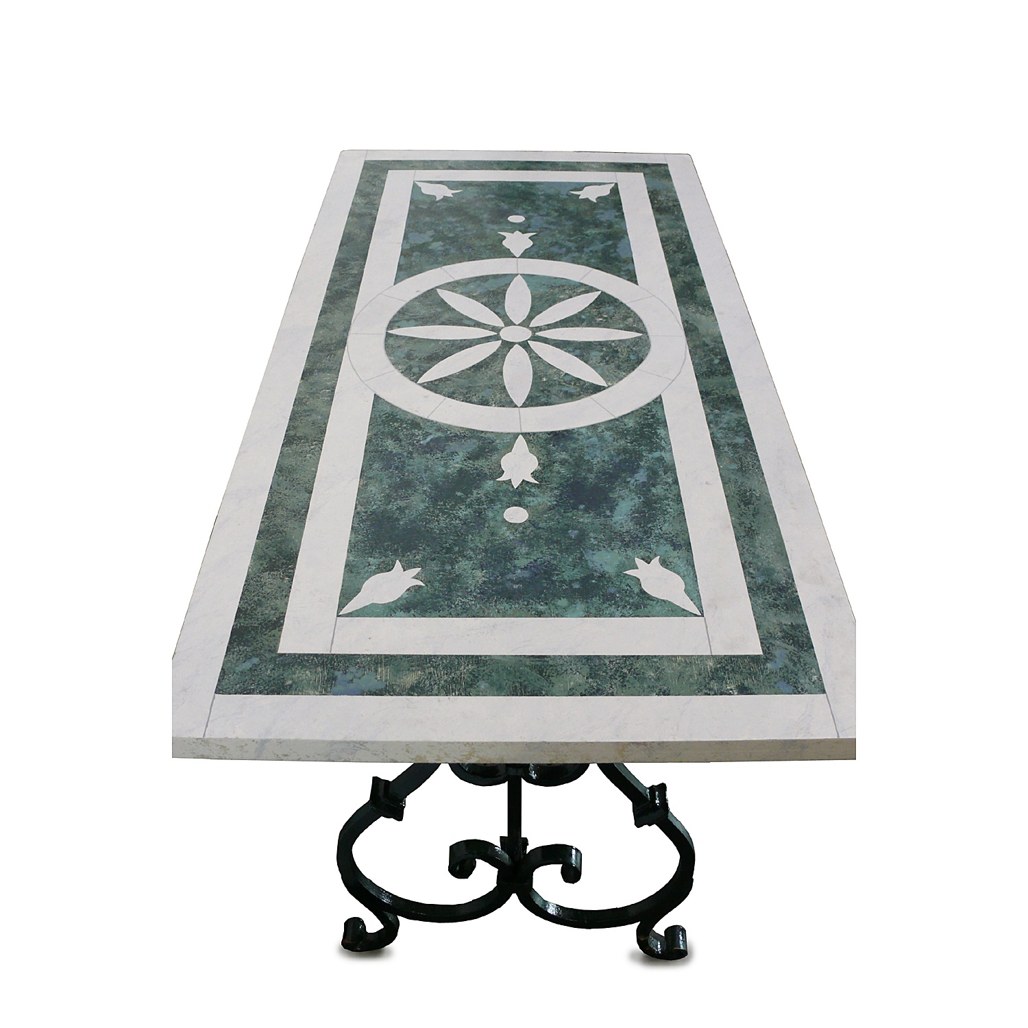 SPANISH WROUGHT IRON TABLE BASE WITH FAUX INLAID GREEN AND WHITE MARBLE TOP 78 CM HIGH 211 CM LONG 102 CM WIDE (X2)