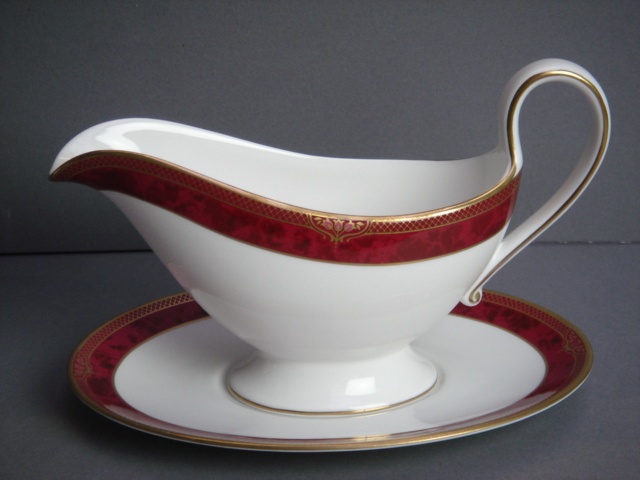 SPODE BORDEAUX RED BORDER SAUCE BOAT AND STAND (X2)