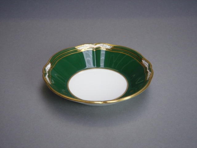 SPODE HARROGATE FRUIT SAUCER DARK GREEN AND GOLD BORDER 13 CM (X12)