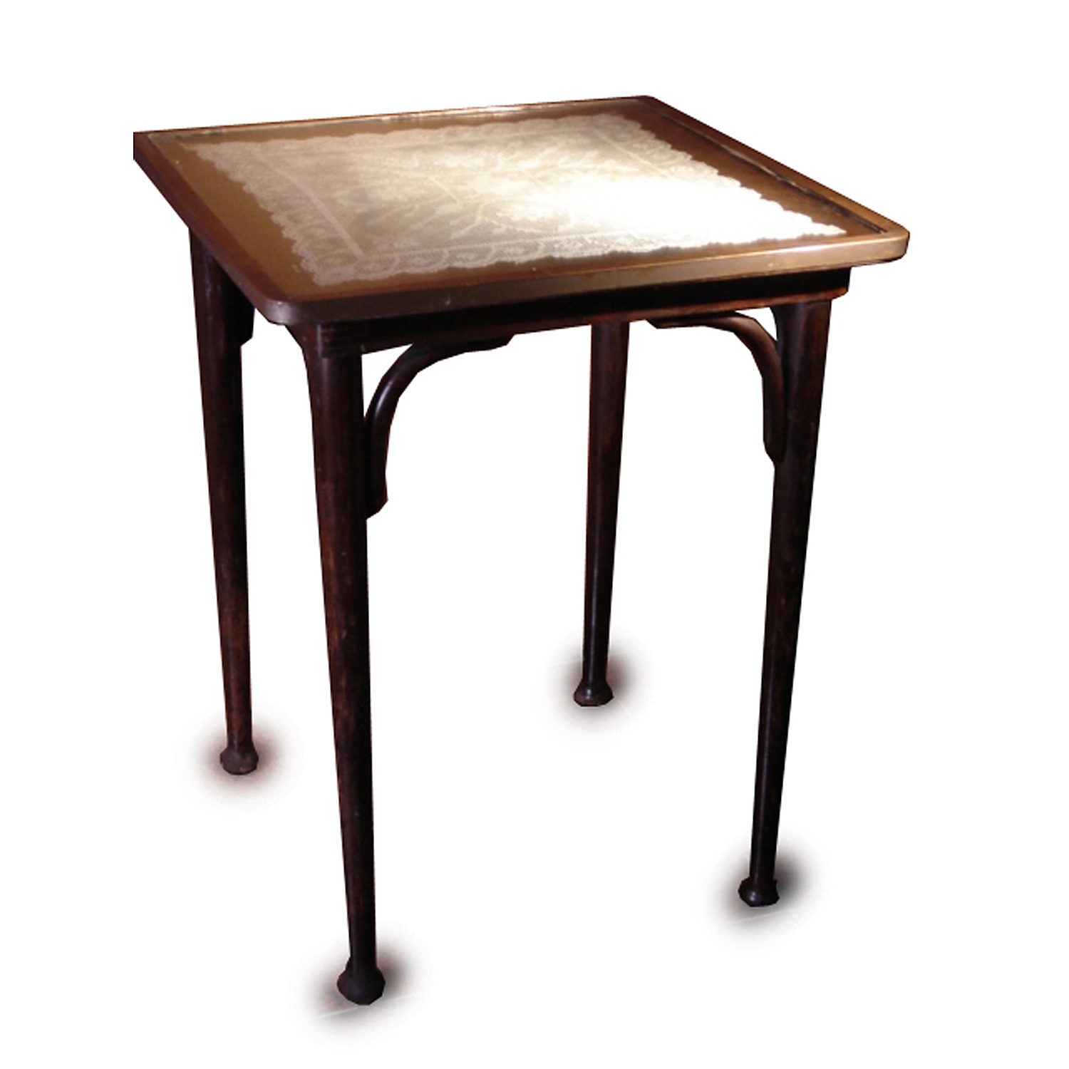 SQUARE BENTWOOD TABLE WITH BRASS TRIM AND LACE PANEL TOP 62 CM LONG 62 CM WIDE 78 CM HIGH