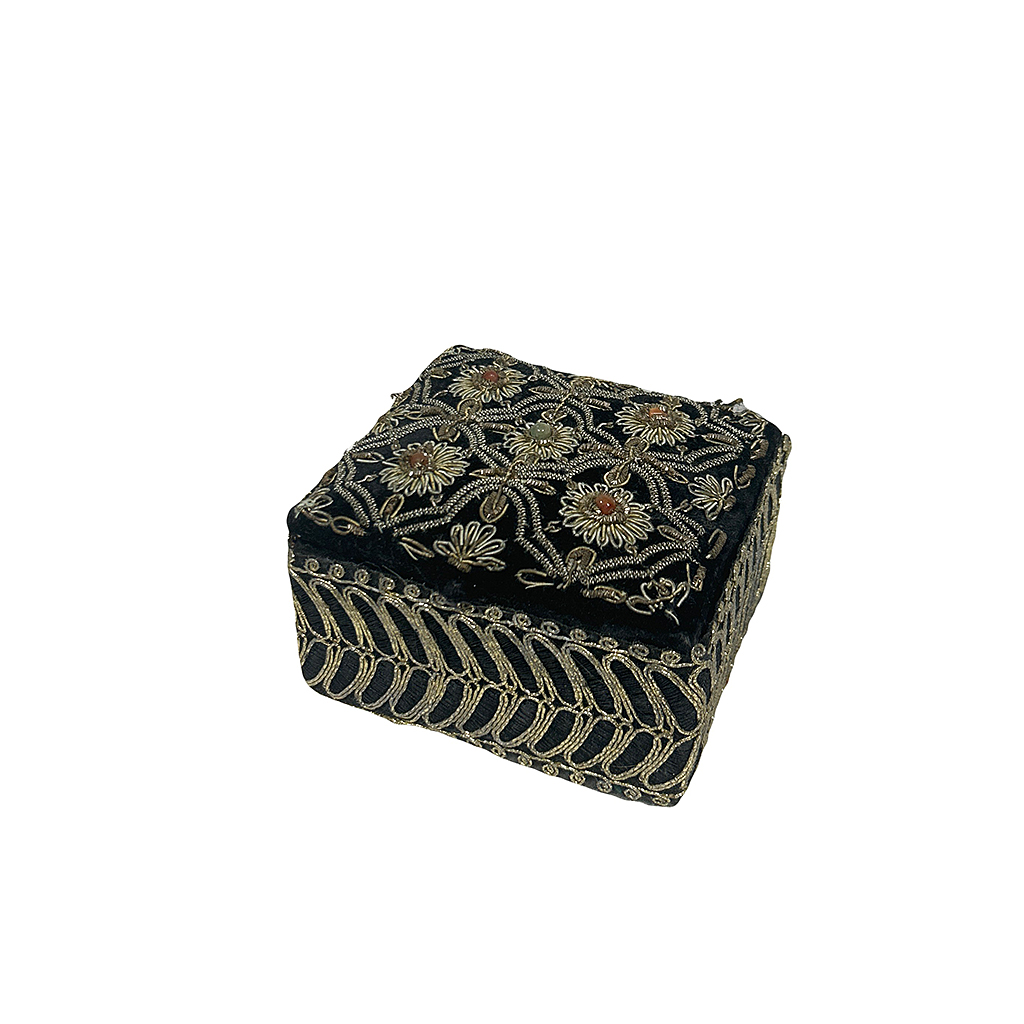 SQUARE BLACK VELVET BOX WITH SILVER METALIC THREAD EBROIDERY DECORATION 12 CM X 11 CM X 6.5 CM HIGH
