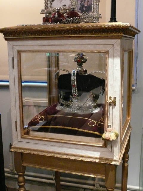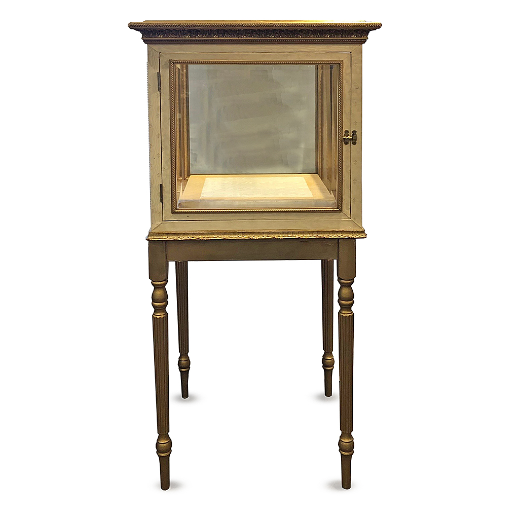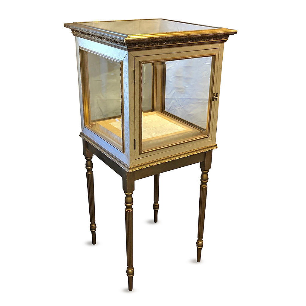 SQUARE CREAM PAINTED SHOW / DISPLAY CASE ON TURNED GILT WOOD LEGS 131 CM HIGH 59 CM WIDE 58 CM DEEP