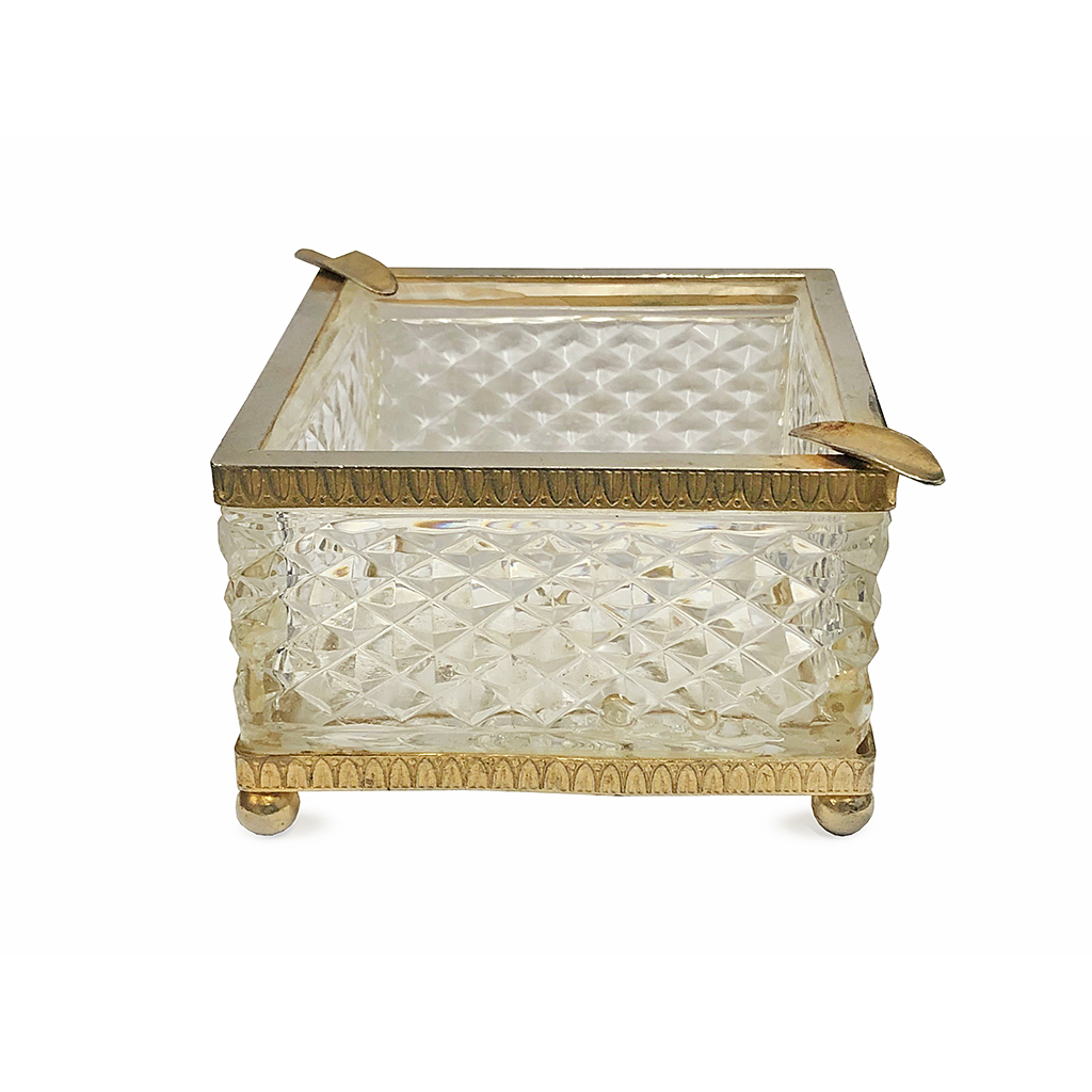 SQUARE CUT GLASS ASHTRAY WITH GILT METAL RIM