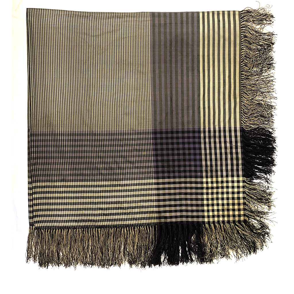 SQUARE GEORGIAN / VICTORIAN WOVEN SILK SHAWL CREAM / BLACK, MAUVE CHECK WITH FRINGING 6' X 6'