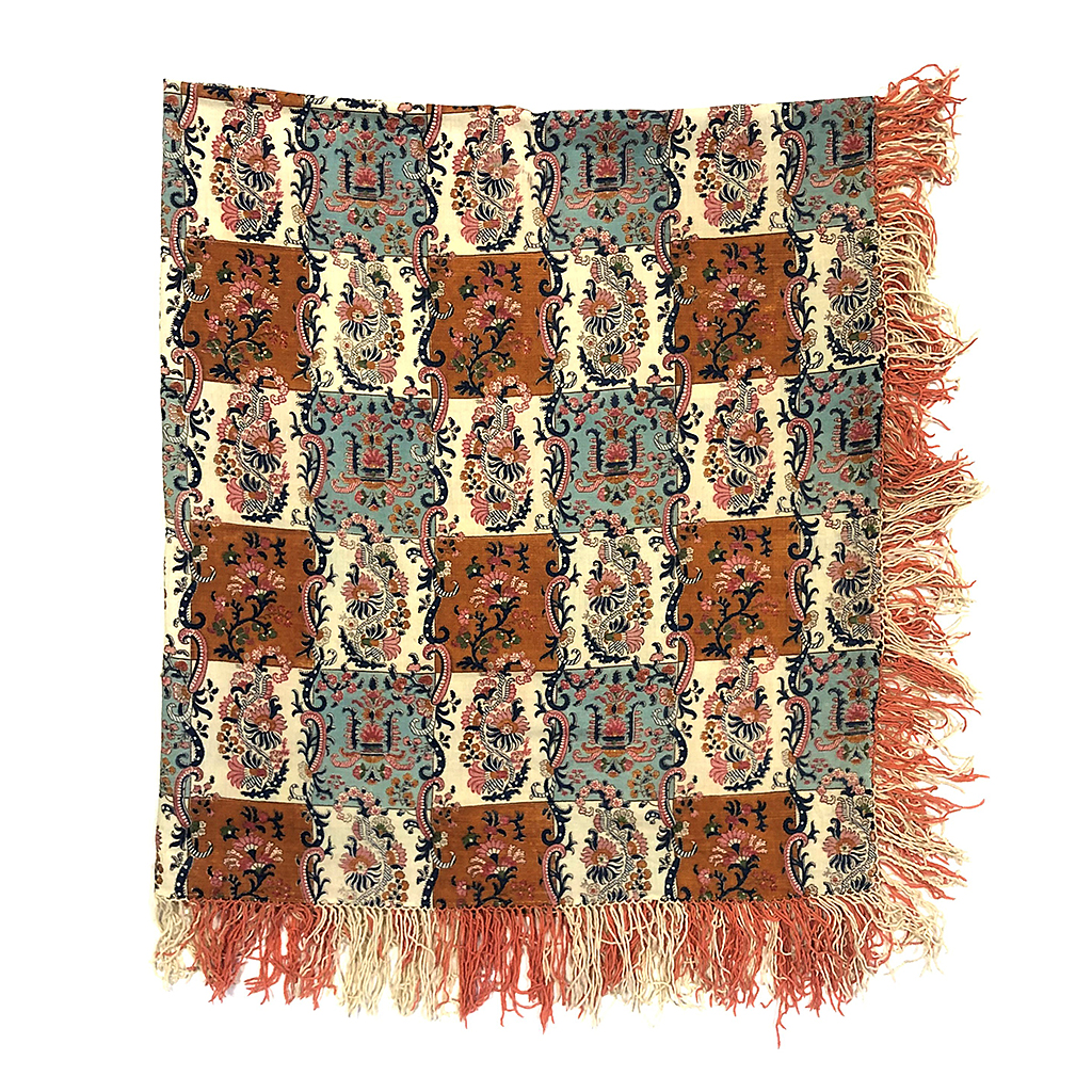 SQUARE PRINTED PAISLEY SHAWL CREAM, PINK AND ORANGE CHECK WITH FRINGING 4'4'' X 4'4''