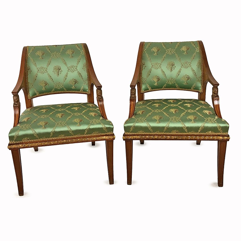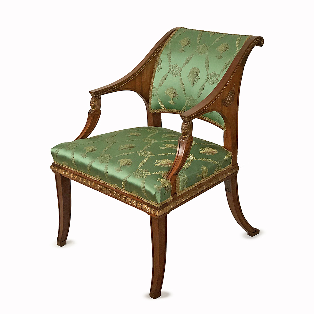 SWEDISH EMPIRE MAHOGANY PART GILDED OPEN ELBOW CHAIR GREEN FLORAL SILK UPHOLSTERY 84 CM HIGH 67 CM WIDE 67 CM DEEP (X2)
