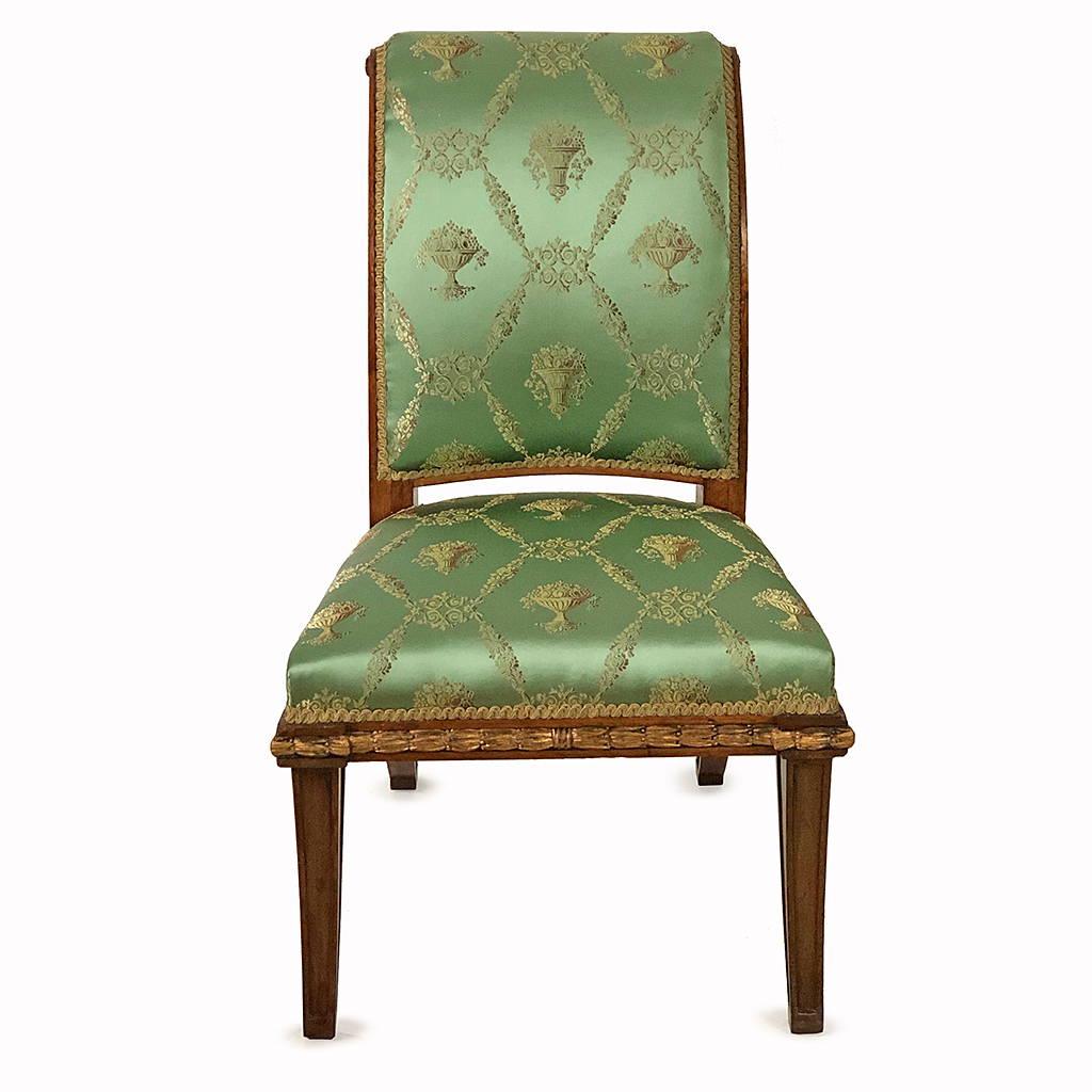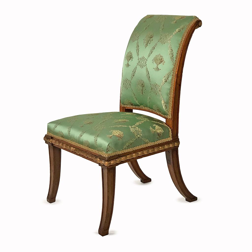 SWEDISH EMPIRE MAHOGANY PART GILDED SINGLE CHAIR GREEN FLORAL SILK UPHOLSTERY 86 CM HIGH 53 CM WIDE 58 CM DEEP (X2)