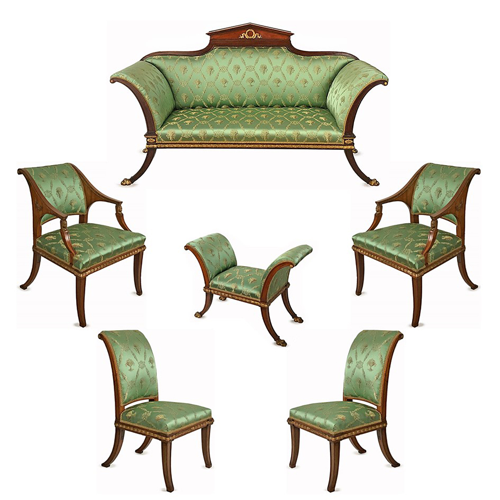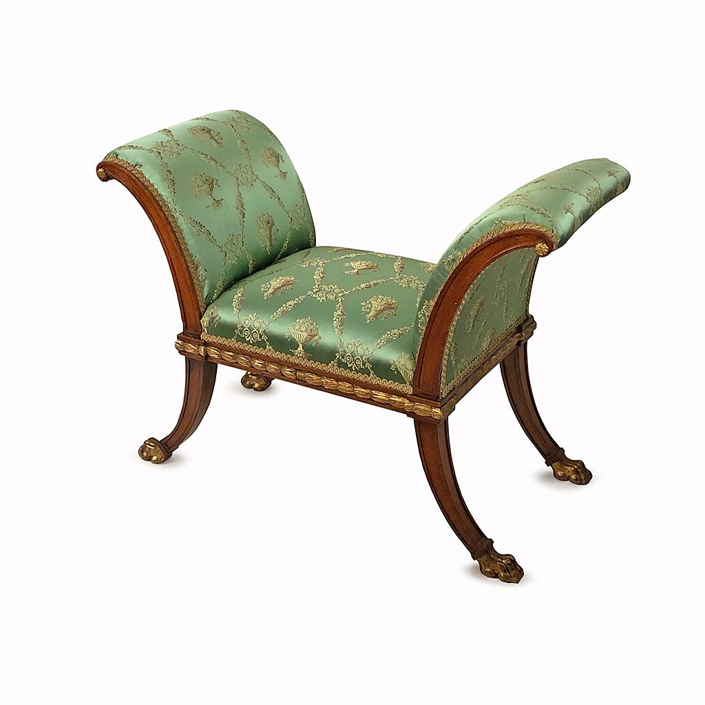 SWEDISH EMPIRE MAHOGANY PART GILDED STOOL GREEN FLORAL SILK UPHOLSTERY 86 CM HIGH 87 CM WIDE 41 CM DEEP