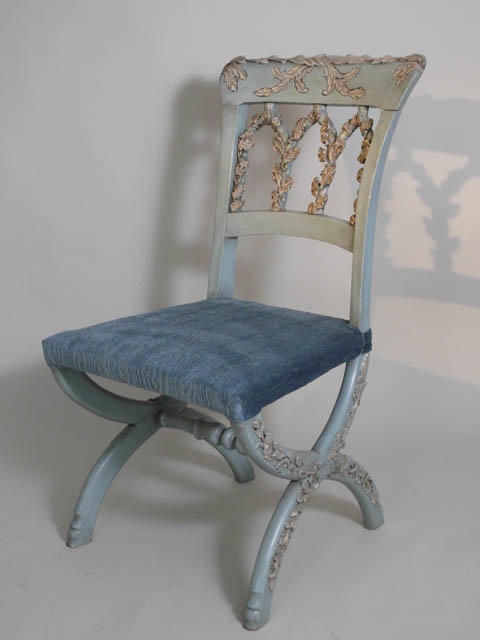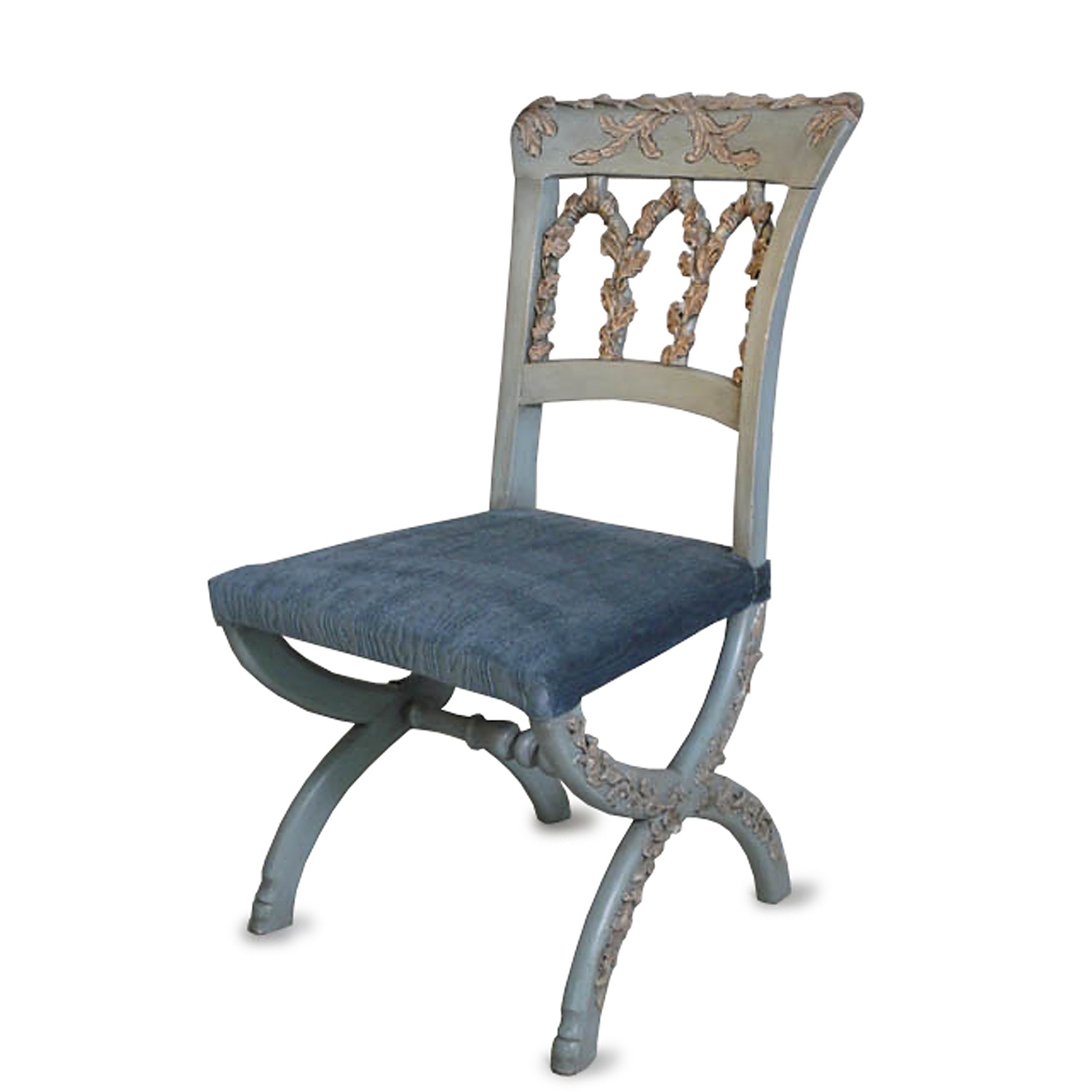 SWEDISH PALE BLUE LEAF CARVED SINGLE CHAIR X FRAME BLUE MOIRE VELVET SEAT 85 CM HIGH (X2)