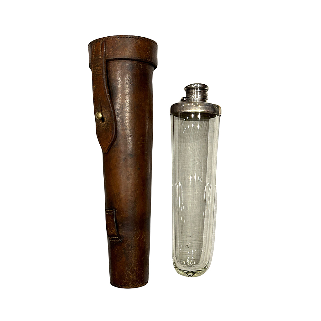 LARGE TAPPERED LEATHER TRAVEL FLASK HOLDER CONTAINING GLASS FLASK WITH SILVER LID 26 CM LONG