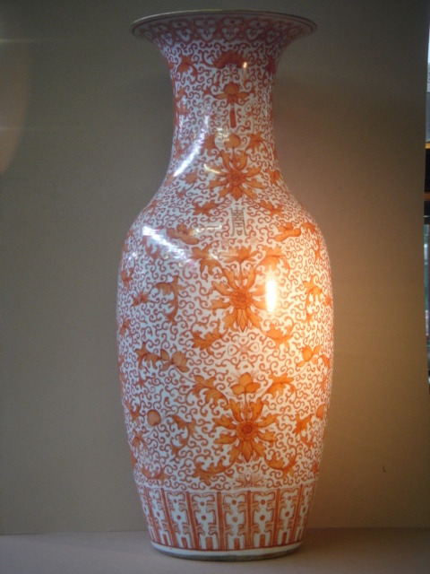 TALL CHINESE ORANGE AND WHITE VASE 61 CM HIGH