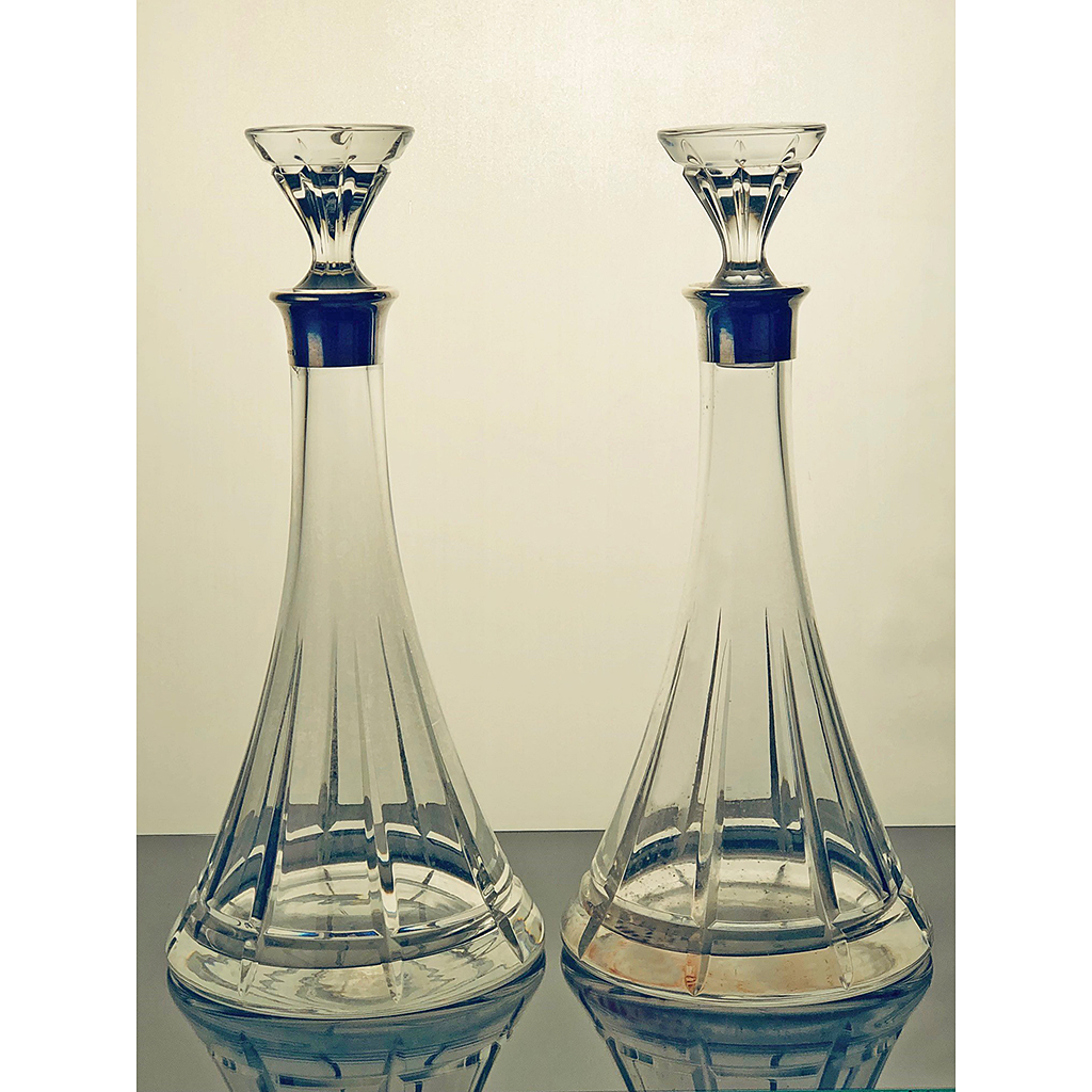 TALL CUT GLASS WINE DECANTER AND STOPPER WITH SILVER COLLAR 34 CM HIGH (X2)