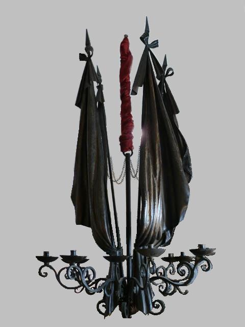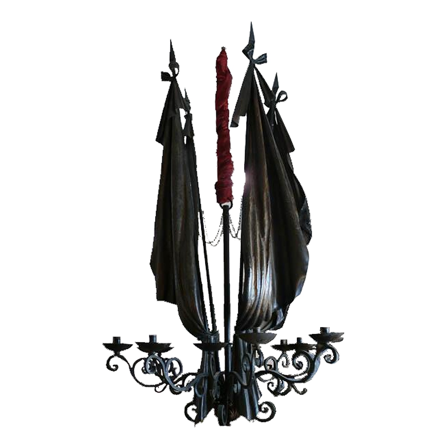 TALL FRENCH CHANDELIER WROUGHT IRON FLAG DESIGN 12 LIGHT 165 CM HIGH 104 CM DIAM.