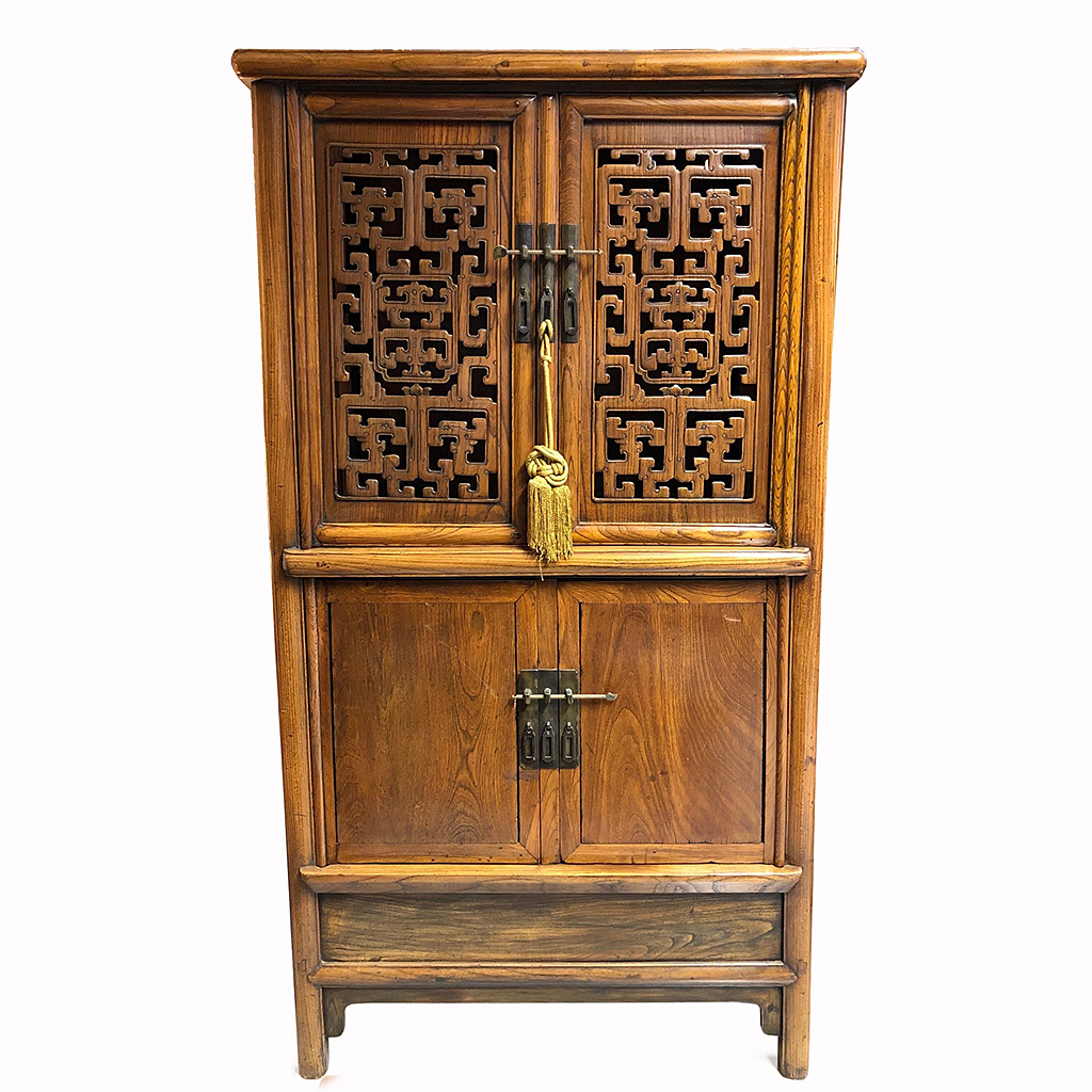 TALL QING DYNASTY LIGHT JUMO WOOD CUPBOARD WITH FINE FRETTED UPPER DOORS AND SLATTED SIDES 165 CM HIGH 86 CM WIDE 48 CM DEEP