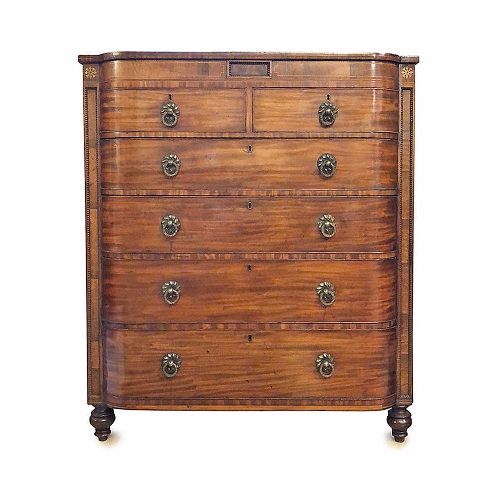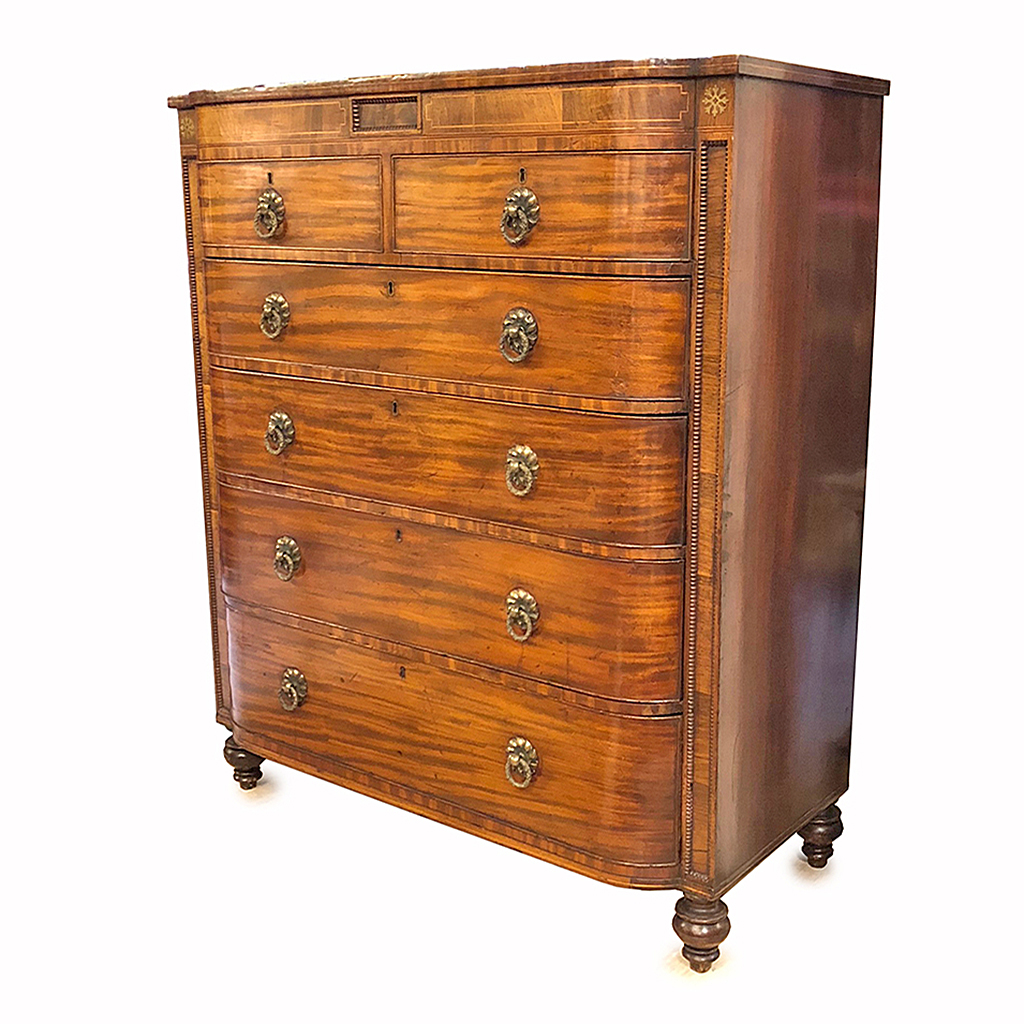 TALL REGENCY LIGHT MAHOGANY AND ROSEWOOD CHEST OF DRAWERS BOW FRONT LOWBOY WITH ORMOLU HANDLES 140 CM HIGH 121 CM WIDE 56 CM DEEP