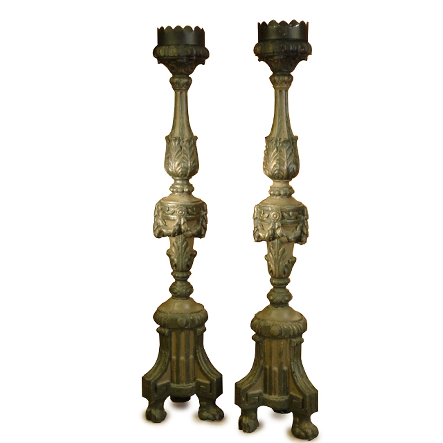 TALL SPANISH 17TH CENTURY FAUX CARVED DARK GILT CANDLESTICK 124 CM HIGH 27 CM WIDE (X2)