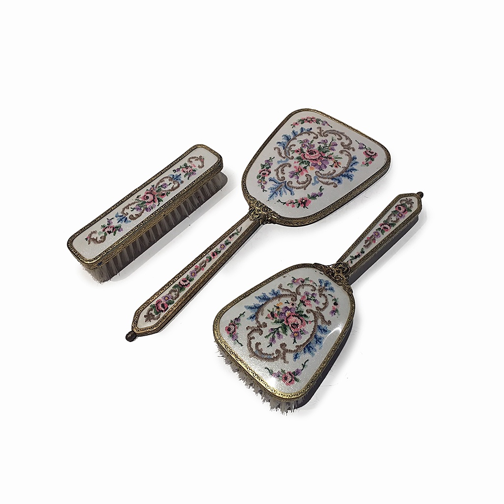 THREE PIECE 1950S ORNATE FILIGREE BRASS HAIR BRUSH MIRROR CLOTHES BRUSH SET WITH PETIT POINT DECORATION OF FLOWERS AND SWIRLS