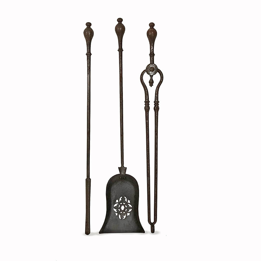 THREE PIECE GEORGIAN STEEL FIRE TOOL SET POKER SHOVEL AND TONGS 75 CM LONG