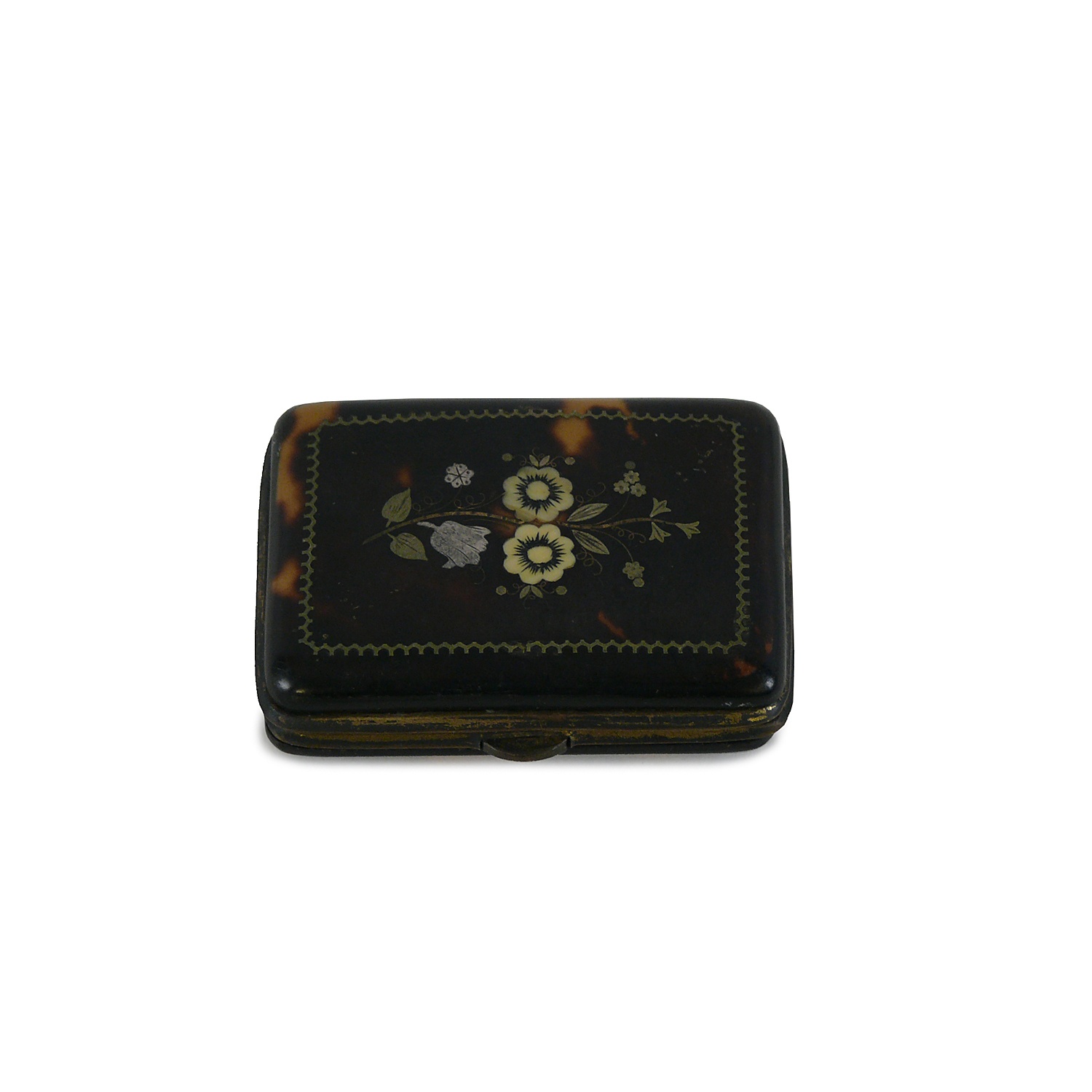 TINY TORTOISESHELL PURSE WITH INLAID BONE SILVER AND BLUE SILK INTERIOR
