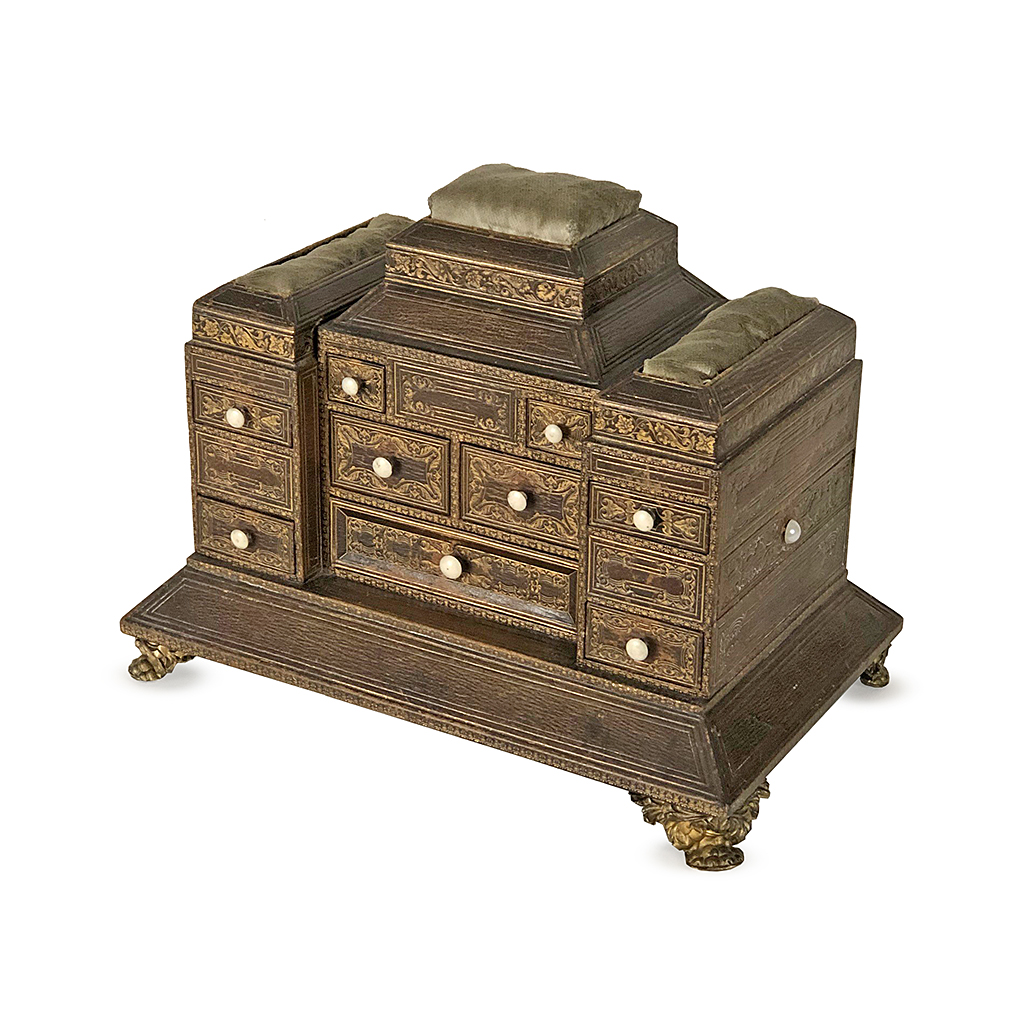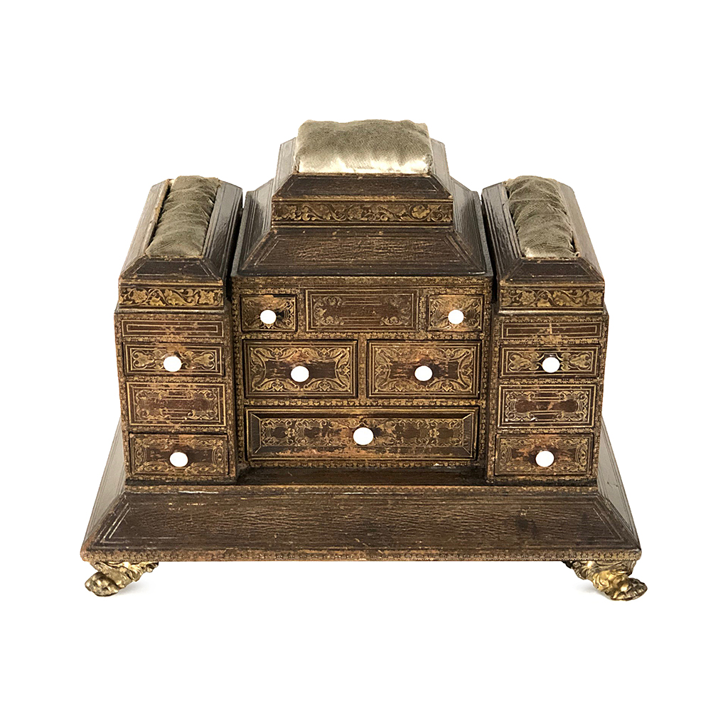 TOOLED LEATHER SEWING BOX WITH NUMEROUS DRAWERS AND PIN CUSHION TOPS ON ORMOLU FEET 23 CM HIGH 29 CM WIDE 19 CM DEEP