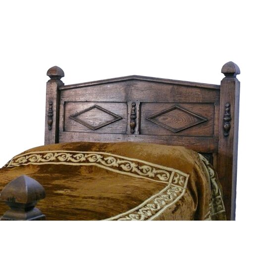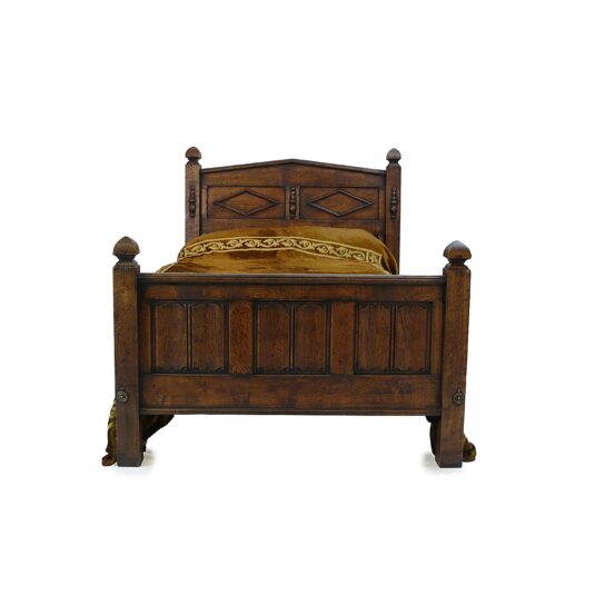 TUDOR STYLE 4' WIDE CARVED OAK BED PEDIMENTED TOP WITH LINEN FOLD PANELS COMPLETE WITH SIDE RAILS AND MATTRESS