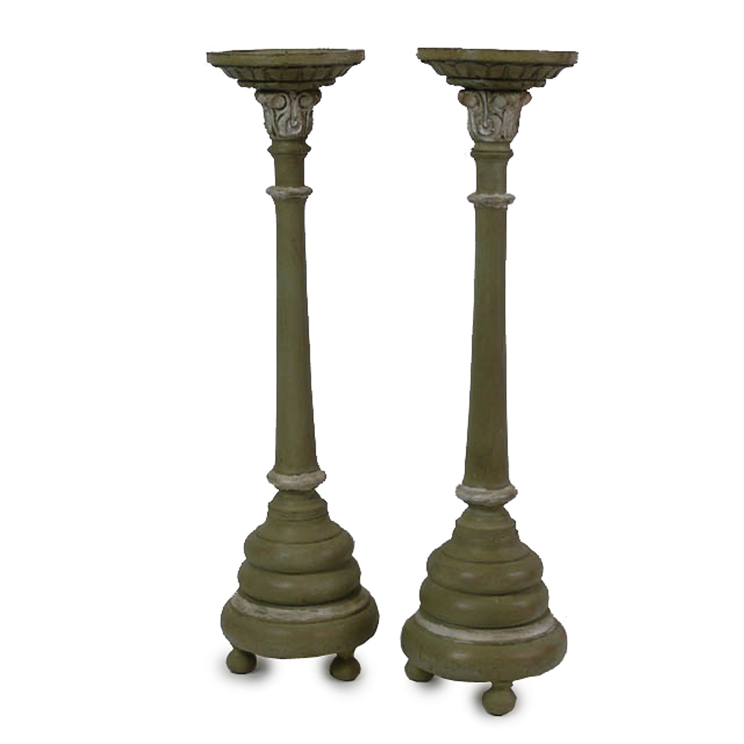 TURNED WOOD CANDLESTICK CELADON GREEN DISTRESSED FINISH WITH CREAM HIGHLIGHTS 61 CM HIGH 15 CM WIDE (X2)