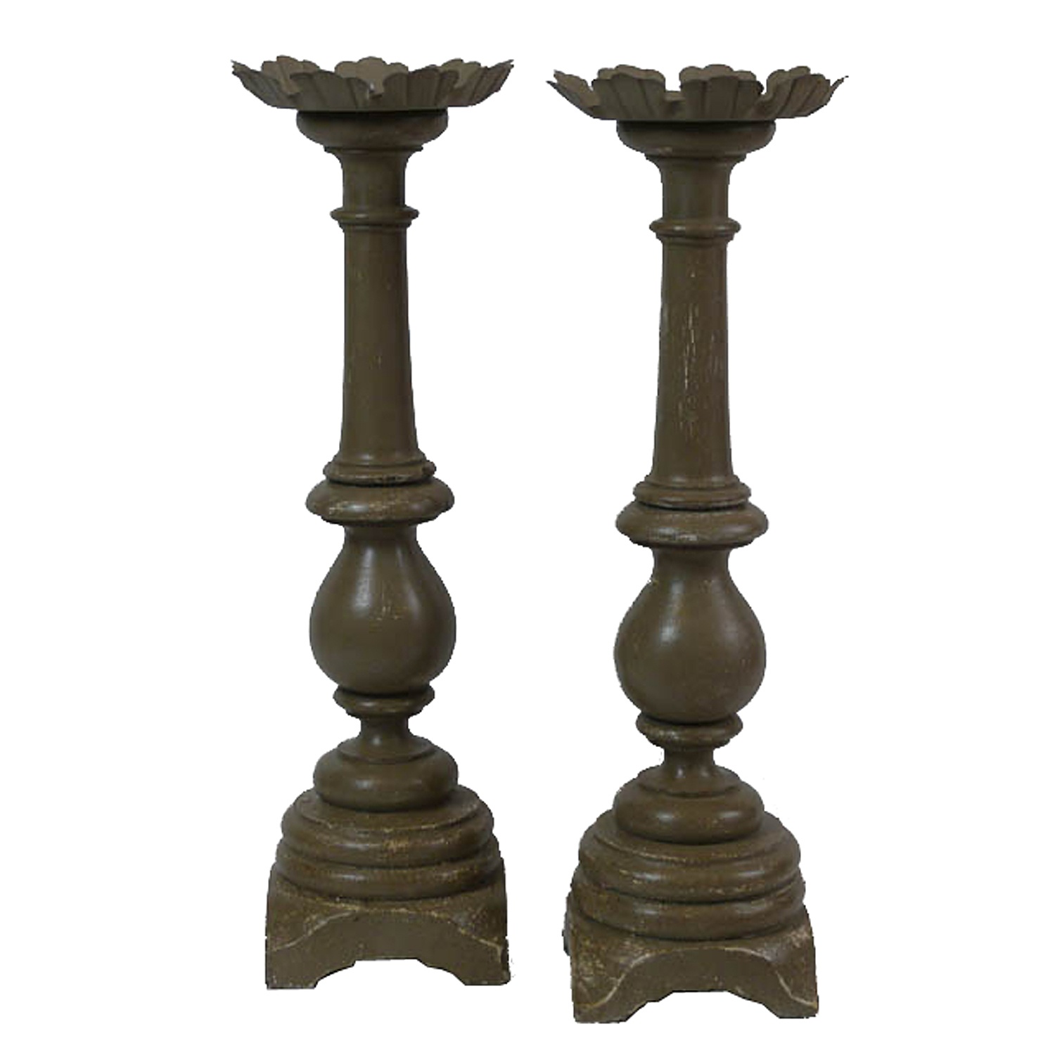 TURNED WOOD CANDLESTICK WITH SQUARE BASE METAL TOPS IN DISTRESSED GREY/GREEN FINISH 57 CM HIGH 15 CM WIDE (X2)