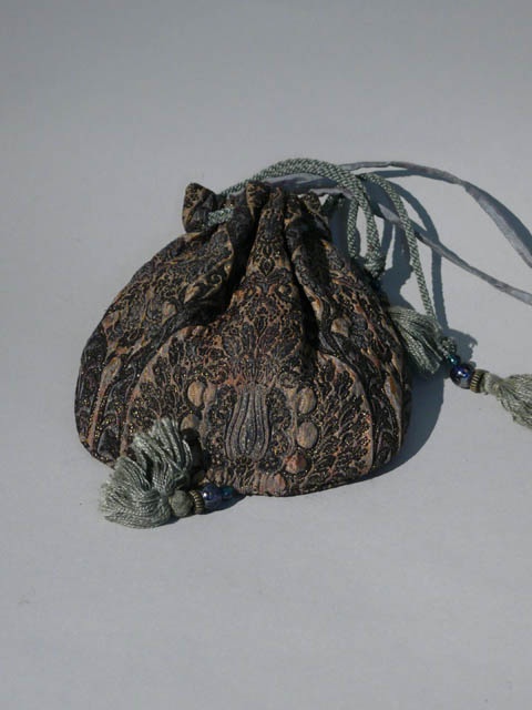 TURQUOISE AND GOLD DAMASK DRAWSTRING HANDBAG WITH THREE BEADED TASSELS