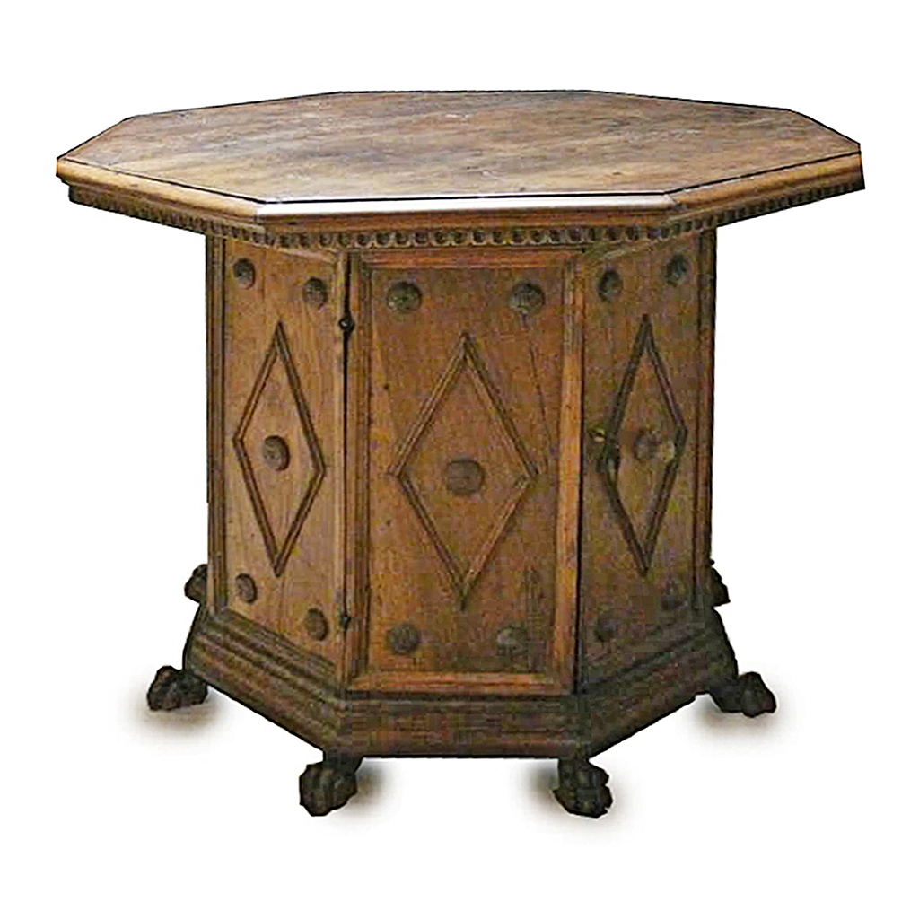 TUSCAN LIBRARY TABLE HEXAGONAL WALNUT WITH CUPBOARD BASE LION PAW FEET 17 TH CENT 100 CM WIDE 79 CM HIGH