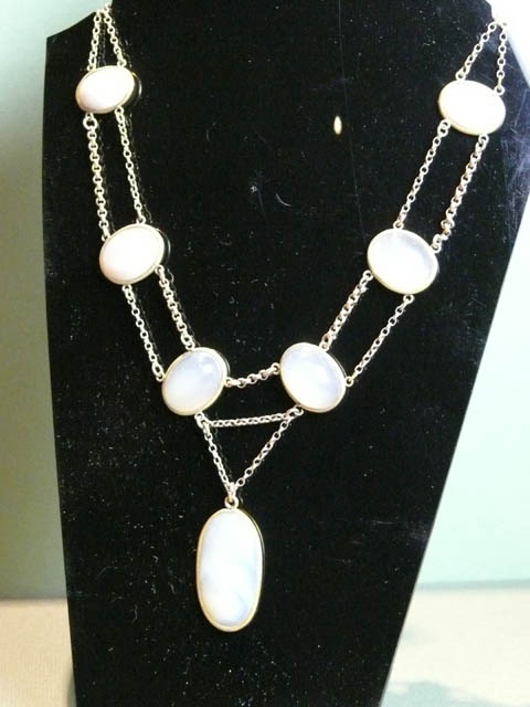 TWO ROW GOLD PLATED NECKLACE WITH OVAL CHALCEDONY STONES AND PENDENT