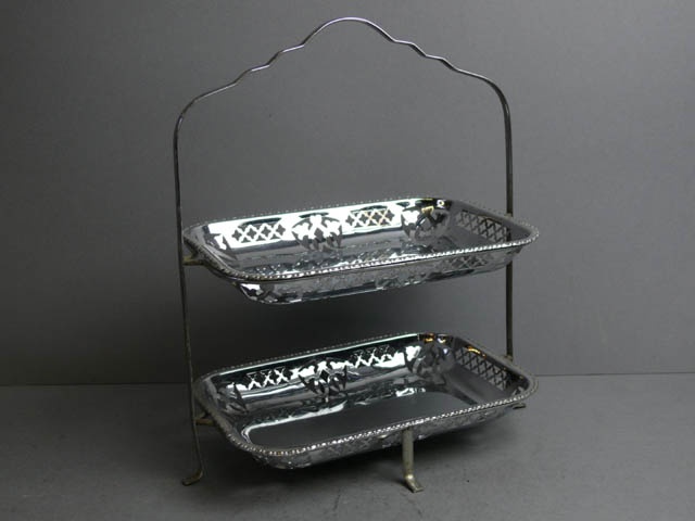 TWO TIER CHROME CAKE STAND WITH RECTANGULAR PIERCED DISHES 25 CM WIDE