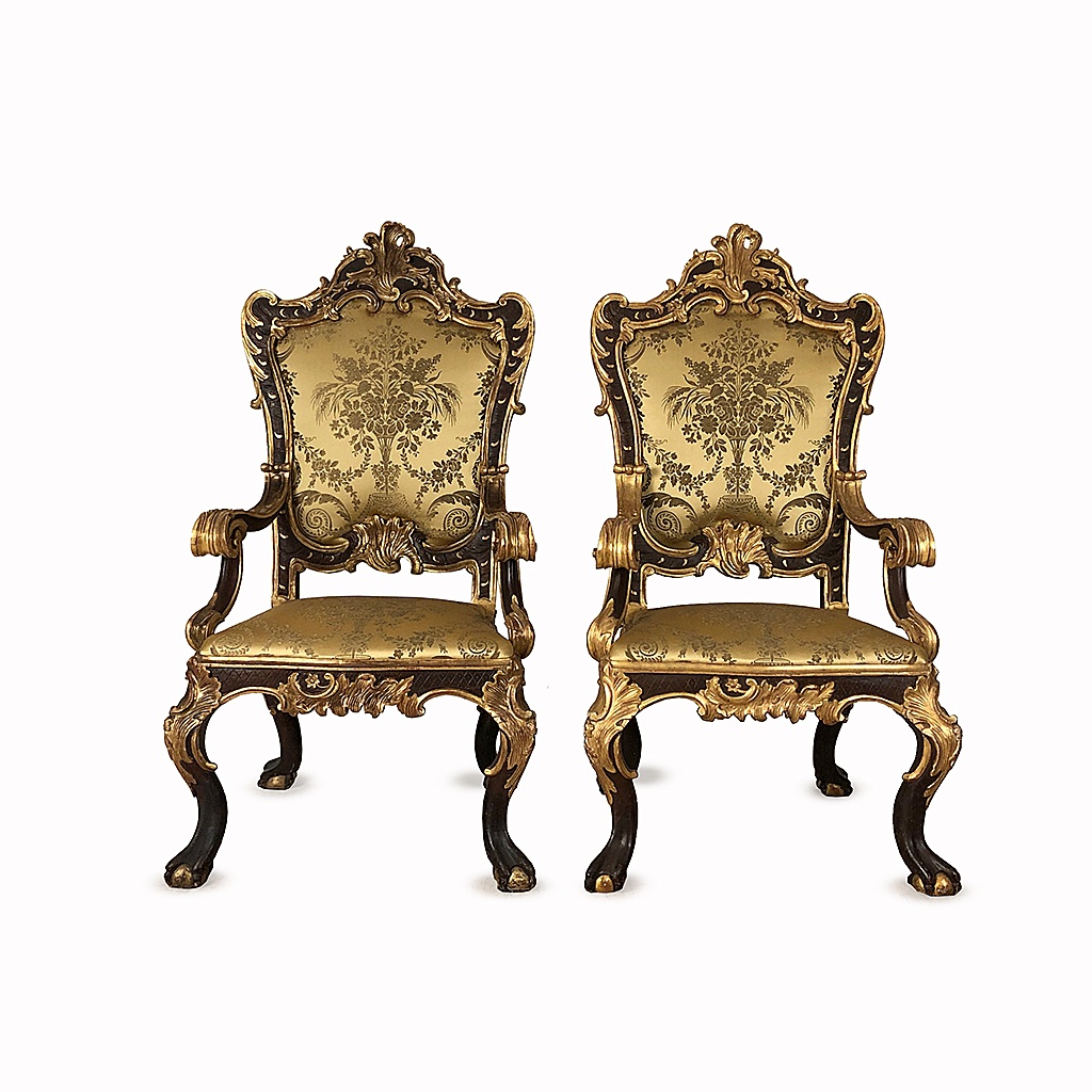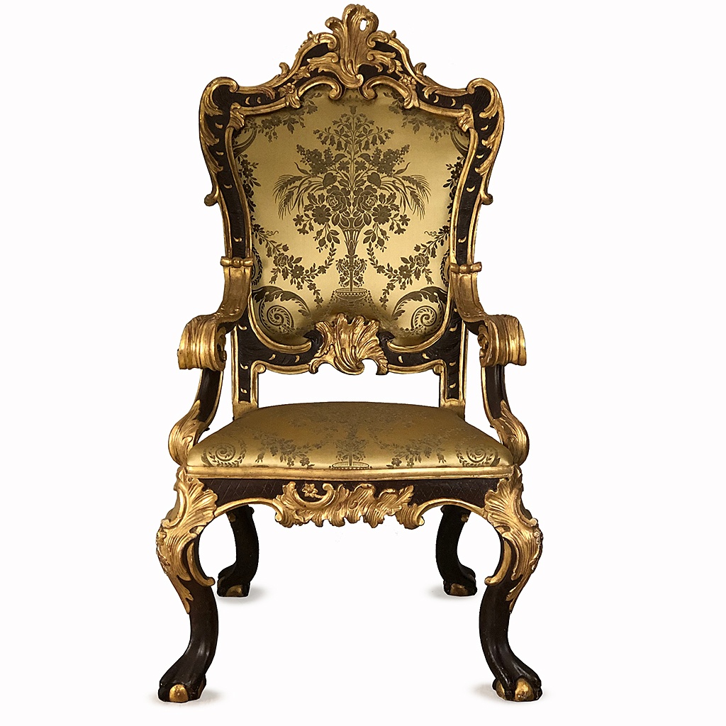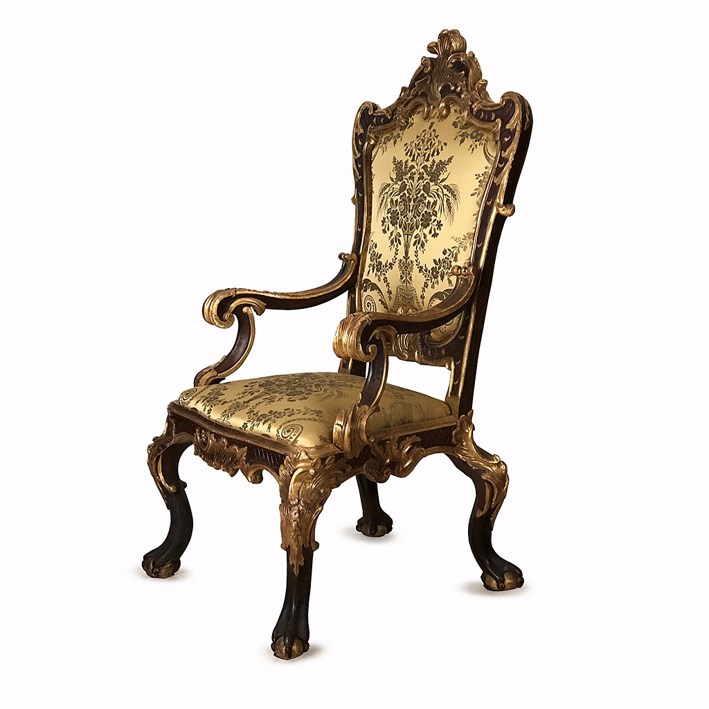 VENETIAN 17TH CENTURY GILDED / TONED THRONE CHAIR WITH GOLD DAMASK OR TAN LEATHER 133 CM HIGH 70 CM WIDE 74 CM DEEP (X4) **SPECIFY UPHOLSTERY**