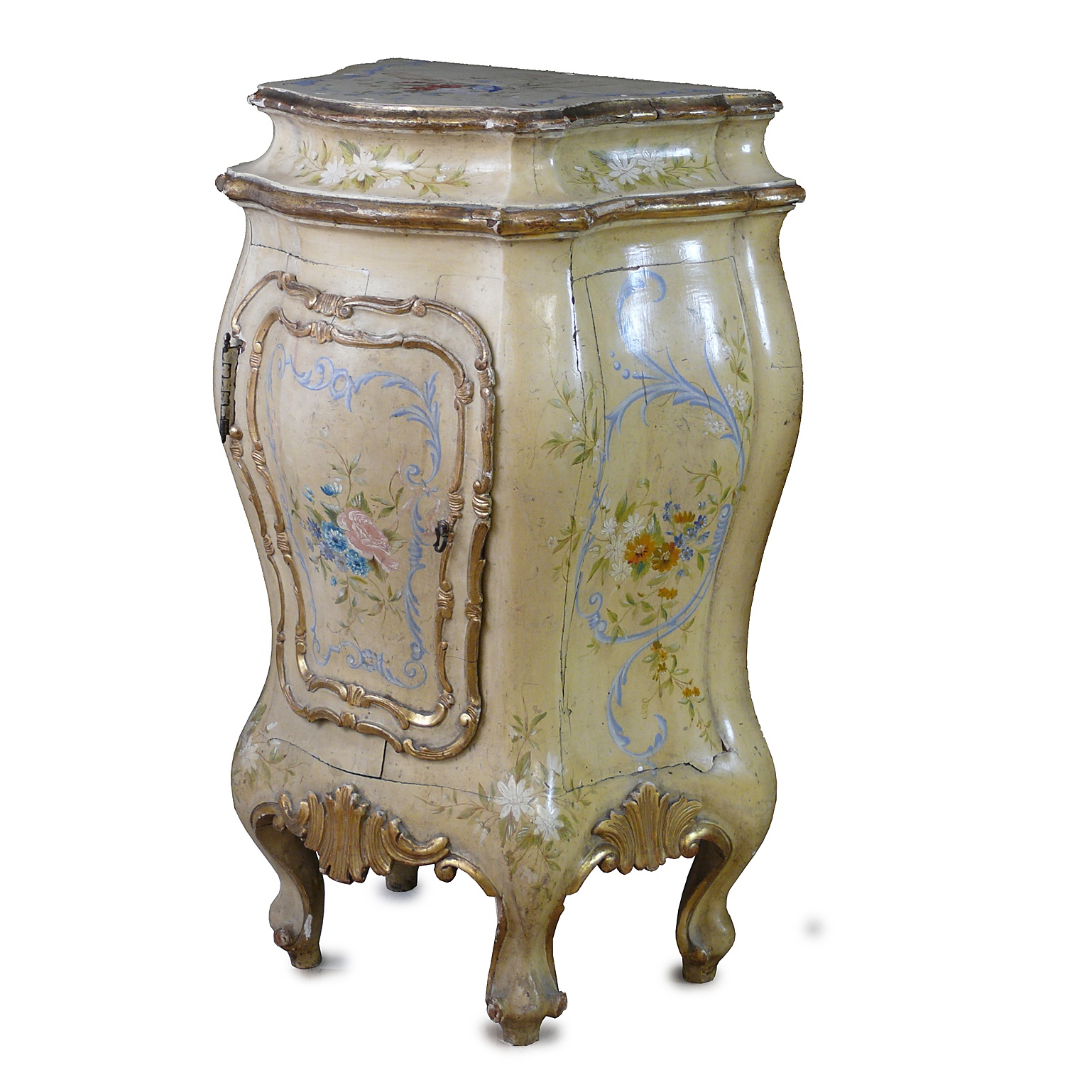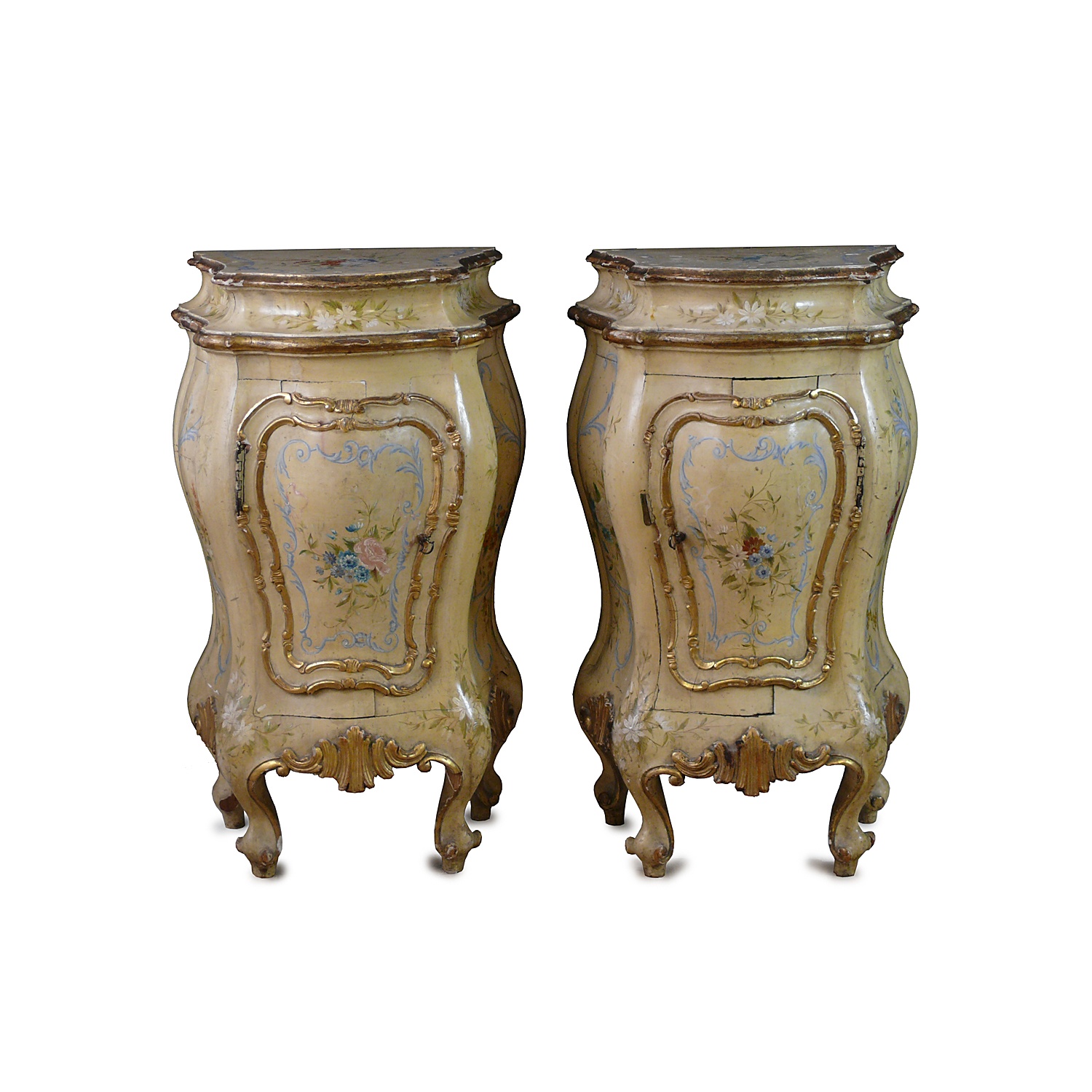 VENETIAN COMMODINI BEDSIDE CUPBOARD BOMBE CARVED CREAM LACQUER POLYCHROME AND PARCEL GILT 82 CM HIGH 50 CM WIDE (X2)