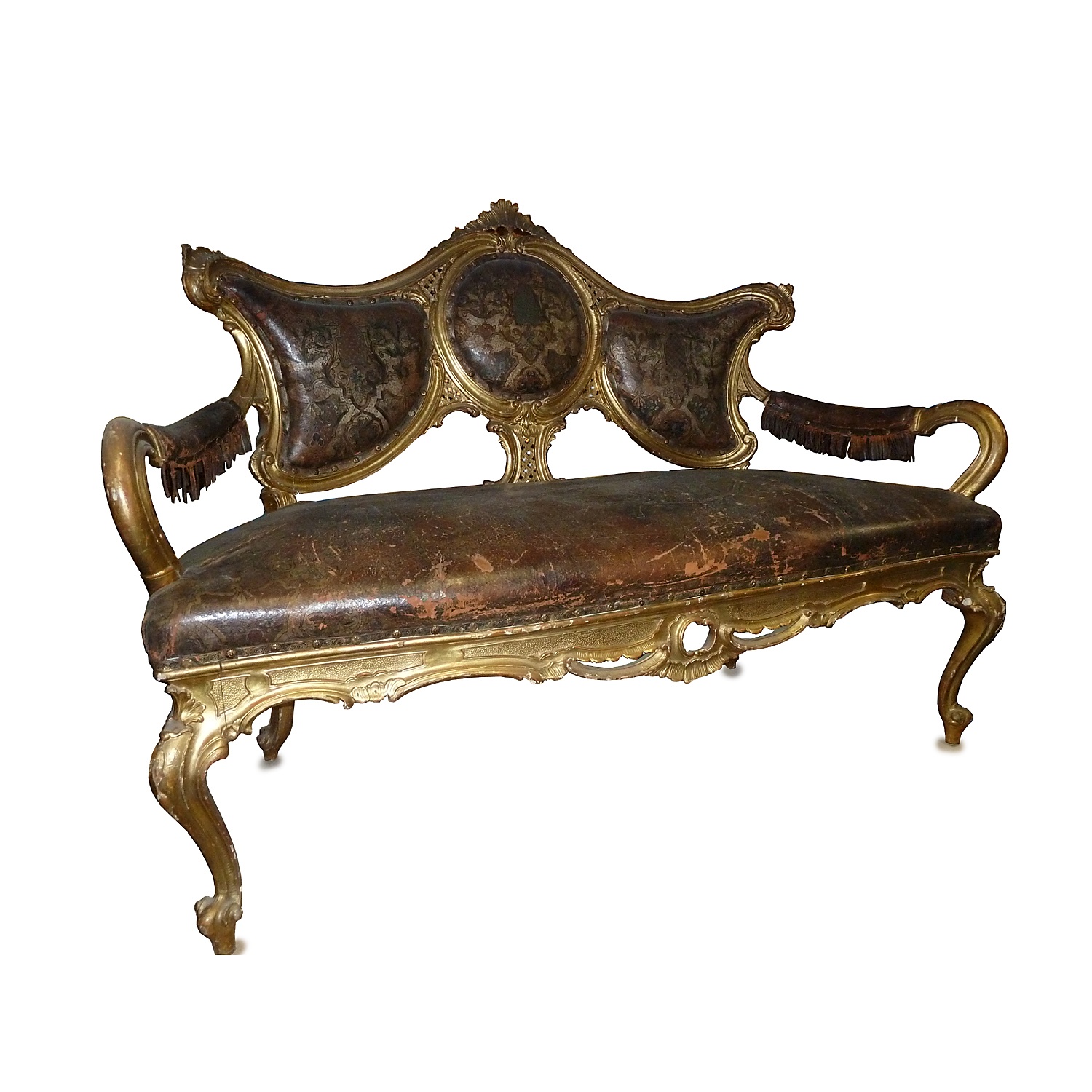 VENETIAN SETTEE / SOFA CARVED AND GILDED WITH TOOLED TAN LEATHER UPHOLSTERY
