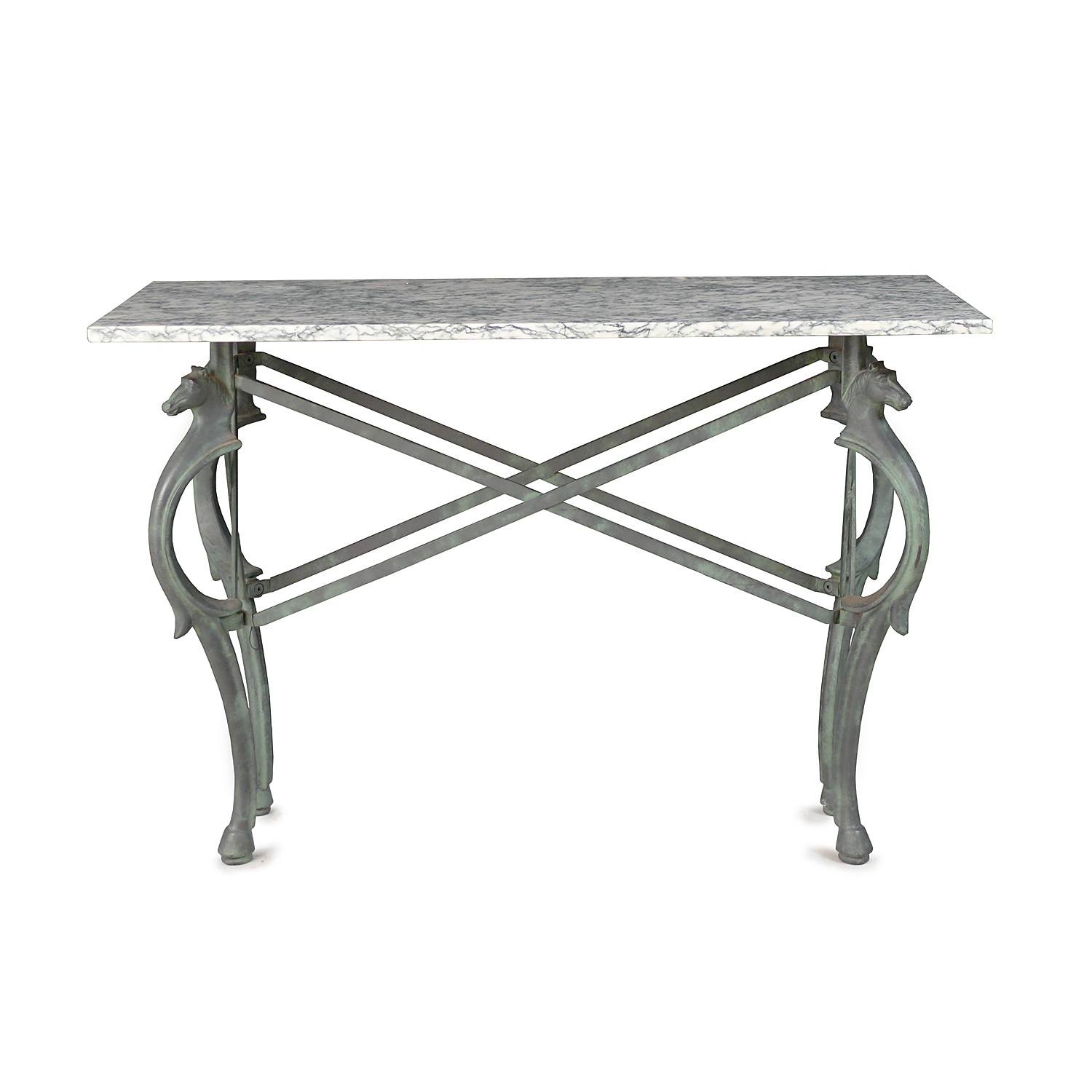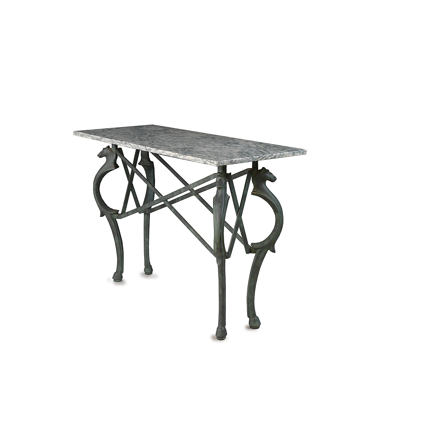 VERDIGRIS BRONZE POMPEII STYLE SIDE TABLE HORSE HEAD LEGS WITH X STRETCHERS AND AN ESTOURS GREEN MARBLE TOP 78 CM HIGH 114 CM WIDE 18 CM DEEP