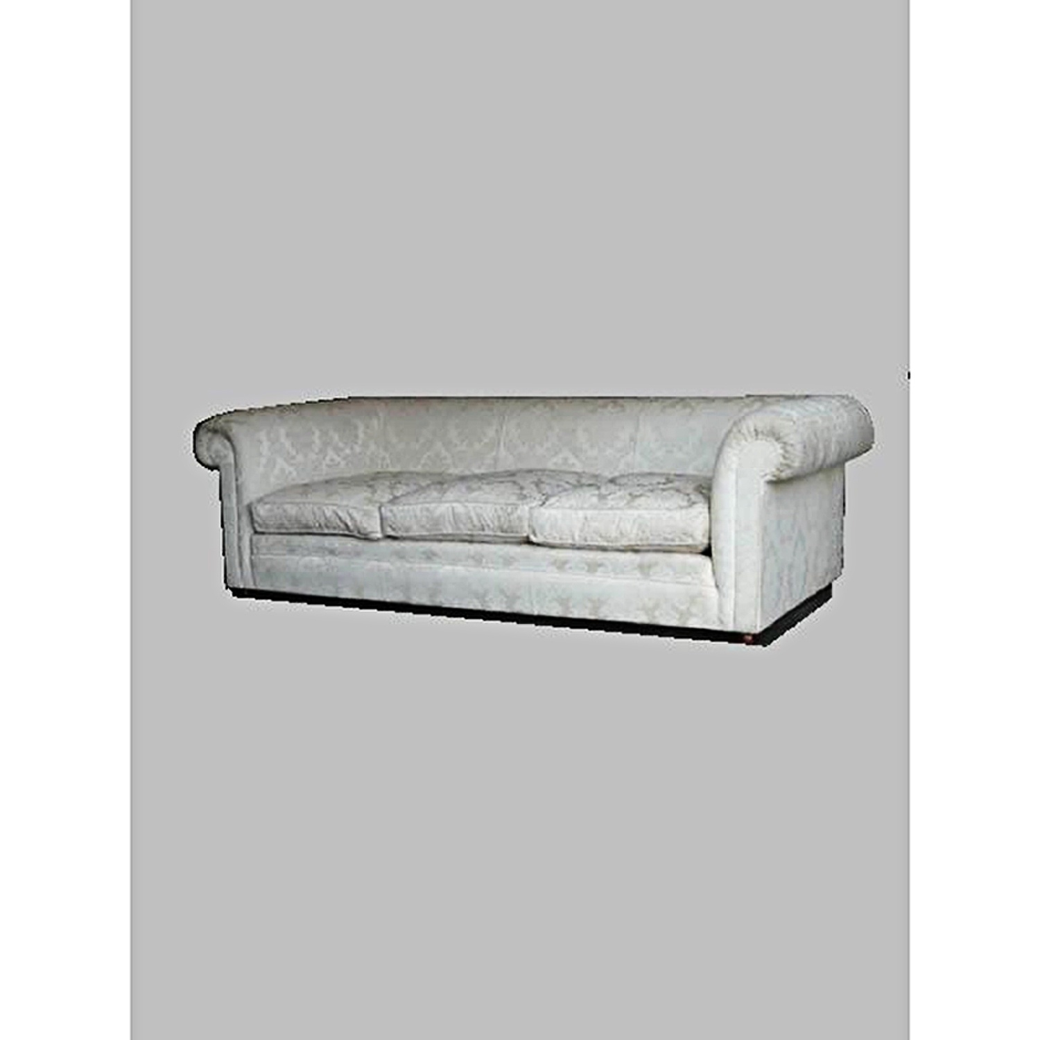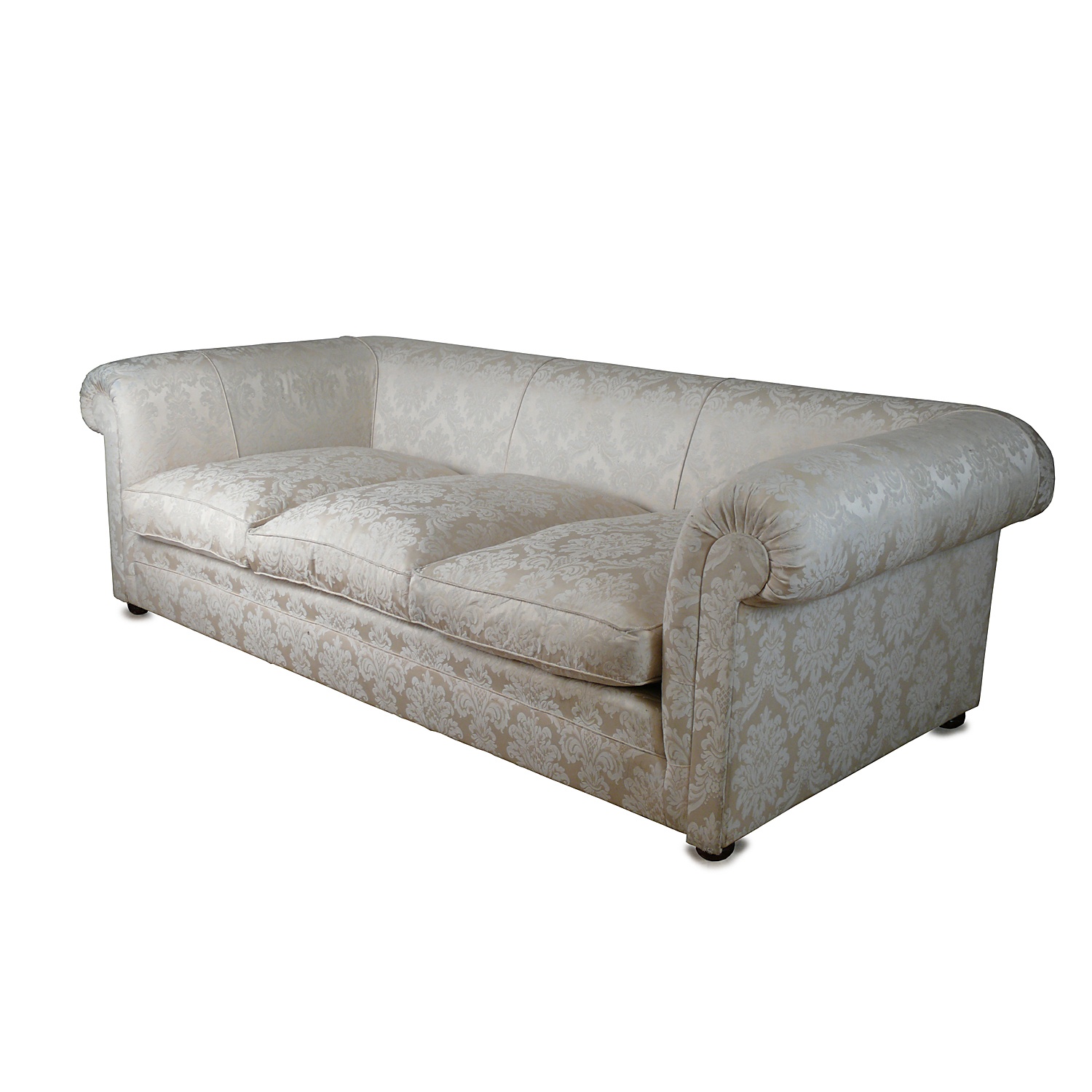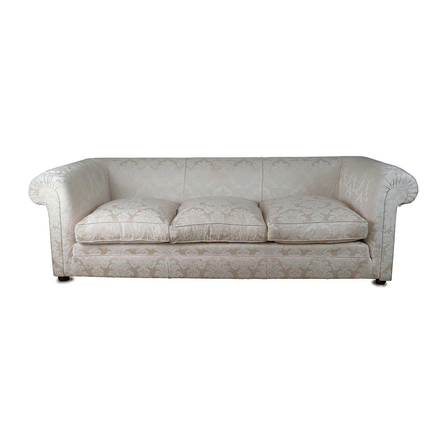 VERY LARGE SETTEE / SOFA 9' LONG 275 CM WHITE DAMASK CHESTERFIELD WITH THREE FITTED CUSHION SEAT (IN STORE AT WHITBY AVE)