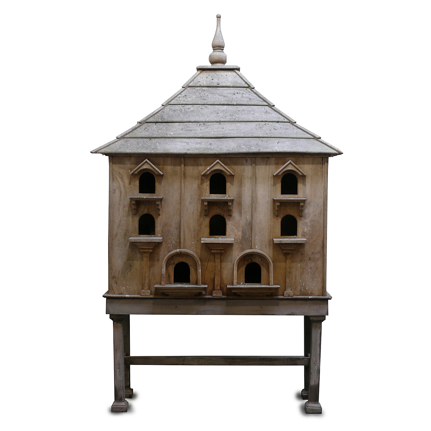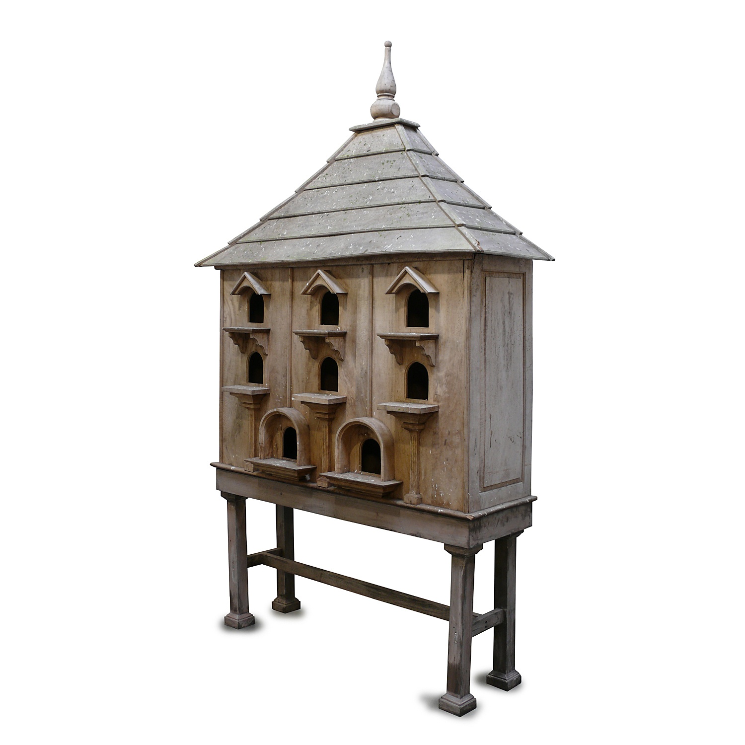VERY LARGE WOODEN DOVE COTE WITH PITCHED TILED ROOF WITH SPIRE FINIAL ON STAND 259 CM HIGH 155 CM WIDE 49 CM DEEP