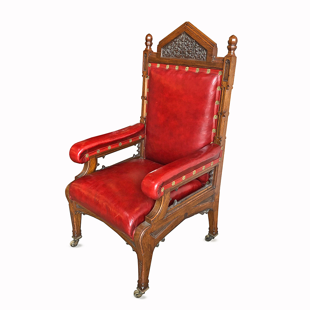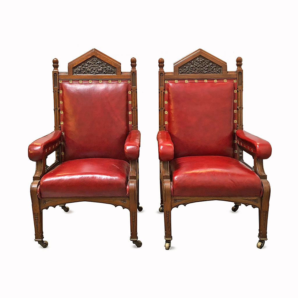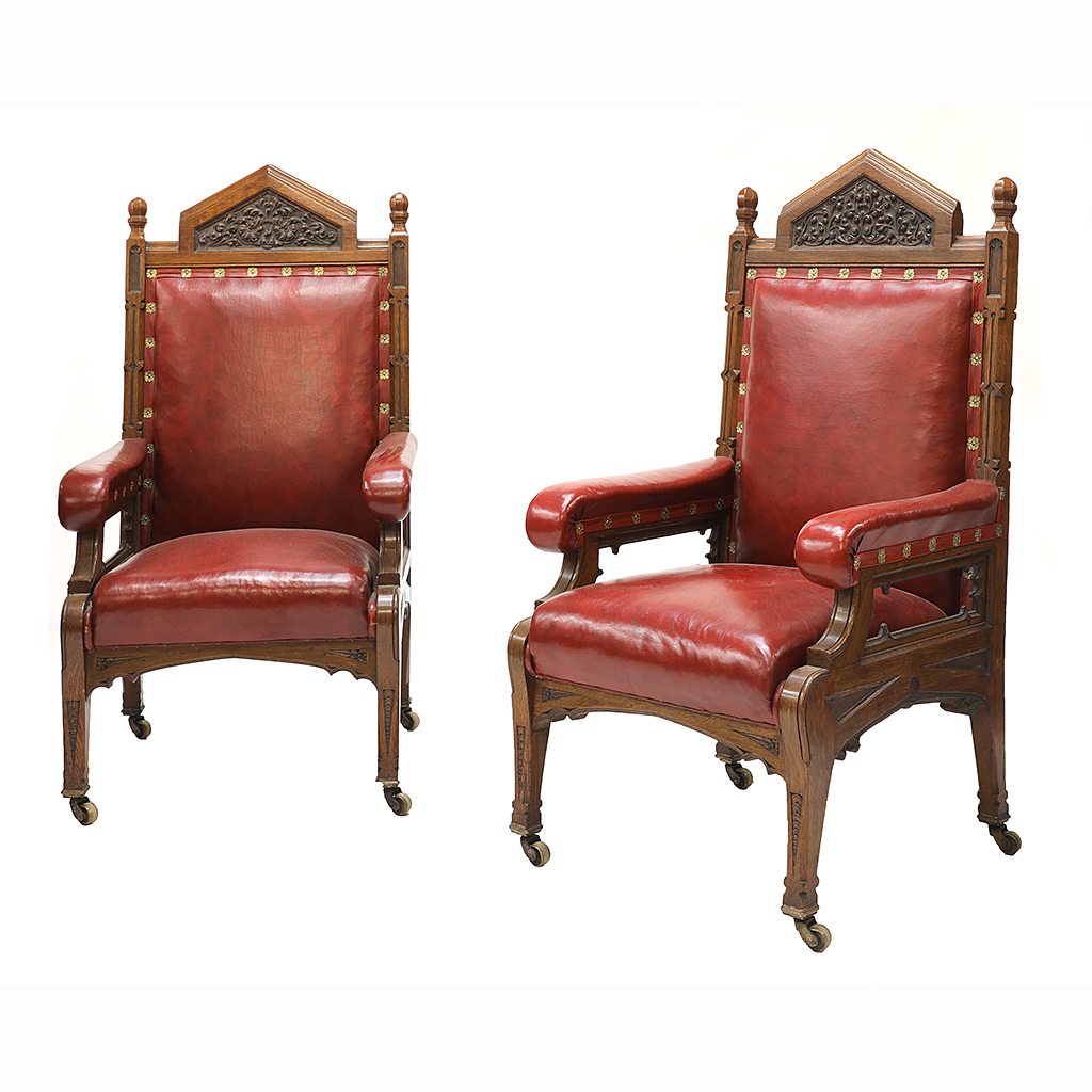 VICTORIAN CARVED OAK THRONE / JUDGES CHAIR GOTHIC REVIVAL WITH CARVED PEDEMENT BACK UPHOLSTERED IN CLARET RED LEATHER 131 CM HIGH 66 CM WIDE 65 CM DEEP (X2)